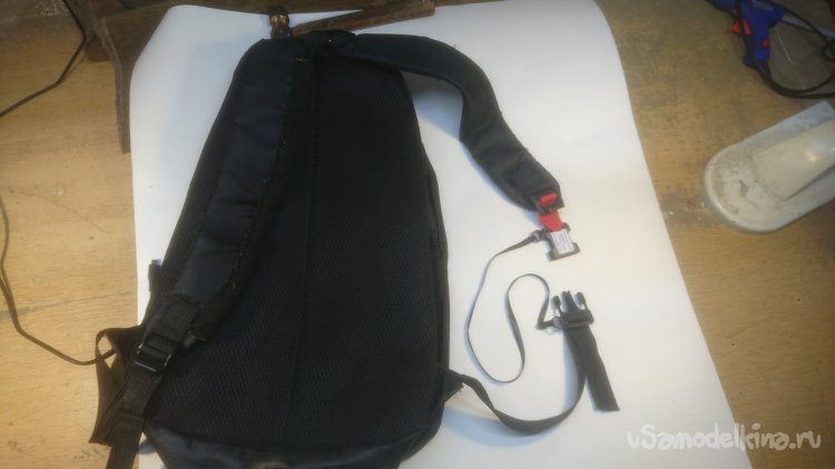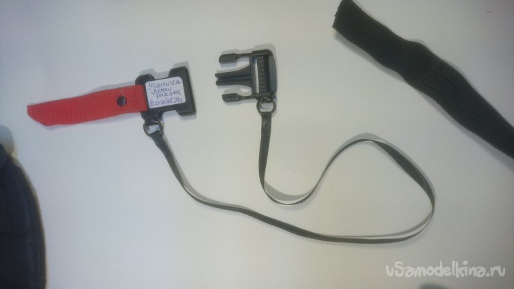 Устройство состоит из фастекса к обоим частям которого прикреплена гибкая лента связывающая эти части между собой, а к верхней части фастекса прикреплена лента для крепления с пряжкой лямки рюкзака