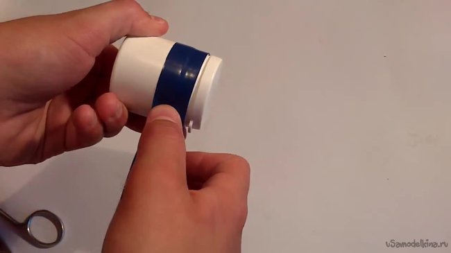 Следовательно, баночка из-под витаминов должна ее обрести. Придавать такую форму мы будем ей при помощи изоленты. Там где у нас дно будет самая широкая часть соковыжималки, ее обматываем пару десятков раз изолентой, чтобы часть получилась широкой. Средний уровень обматываем на десяток раз меньше, и само горлышко баночки всего пару раз, т.к. это будет самой узкой частью конструкции.
