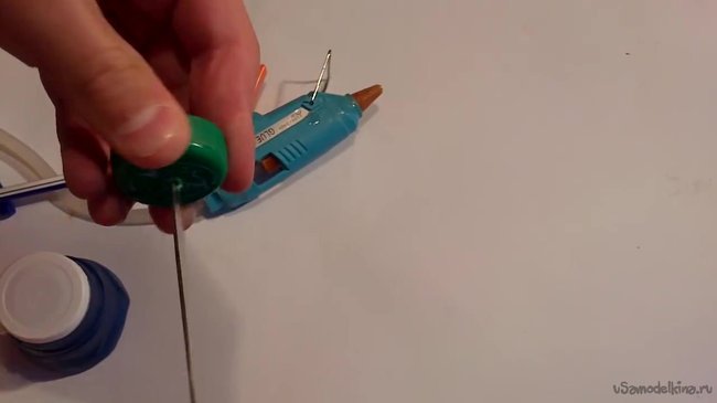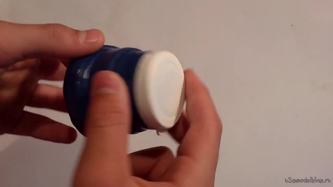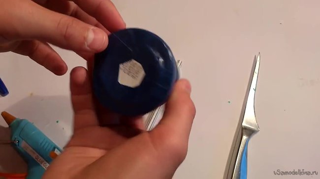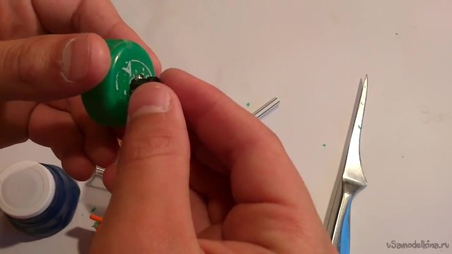 Но проделав все манипуляции, мы не добились многоярусности, поэтому возьмем пластиковую крышку от бутылки, при помощи ножа проделаем в ней отверстие, по ширине равное затычке от ручки.