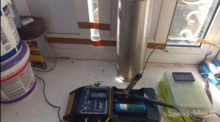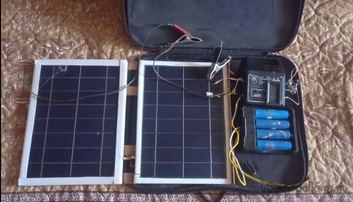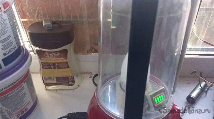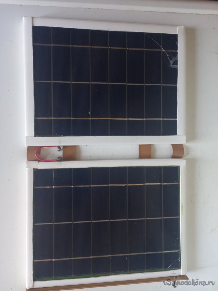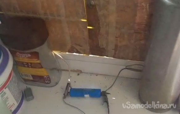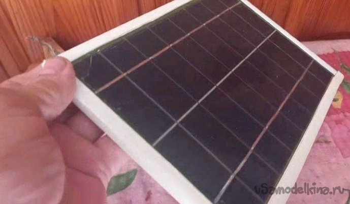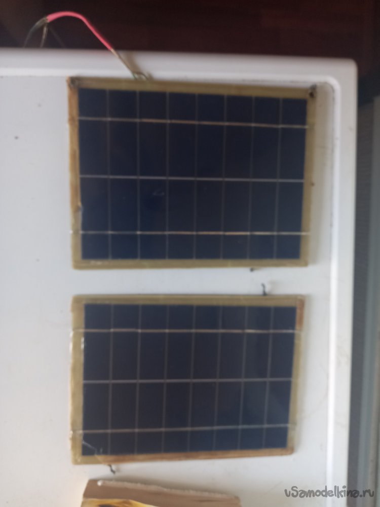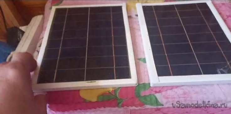 Вот я и подумал, а почему бы и не помочь хорошему человеку. Тут как раз на днях приобрел б/у солнечные панели, потертые правда, но рабочие. Сходил к пчеловоду, взял его лампу, в ней я установил когда-то шесть литий-ионных аккумуляторов общей емкостью шесть ампер. На оконном стекле закрепил две солнечные панели, на прямых солнечных лучах под стеклопакетом они выдают порядка семи вольт, один ампер.