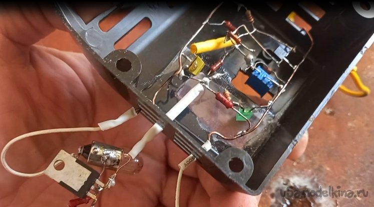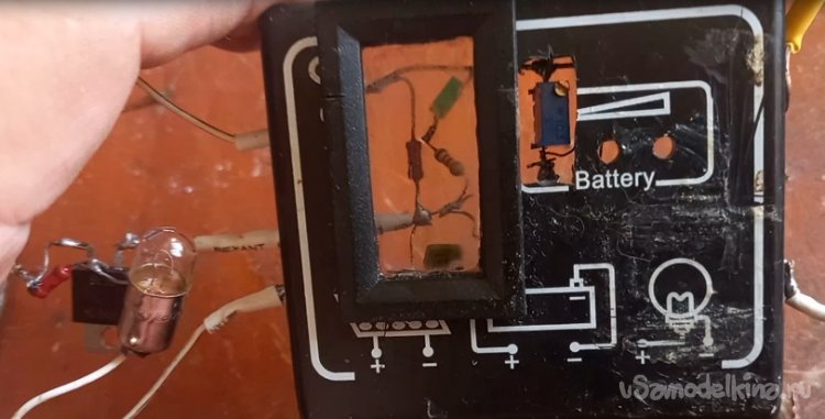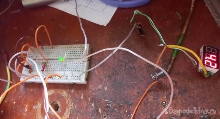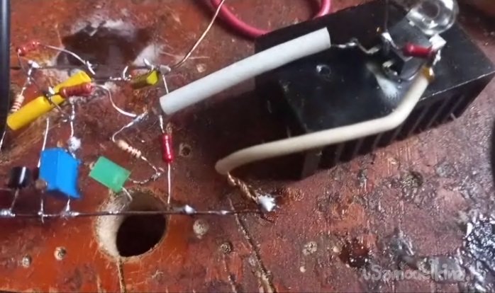Сначала попробовал накидать детали на монтажной плате без мосфета, все работает как обещал автор. Убедившись, что схема рабочая, спаял из опробованных деталей навесным монтажом. Добавил мосфет на радиаторе, напряжение открытия всего четыре вольта, думал полевой транзистор будет раскаляться, но потом отказался от радиатора. Воткнул балансир, автомобильную лампу.