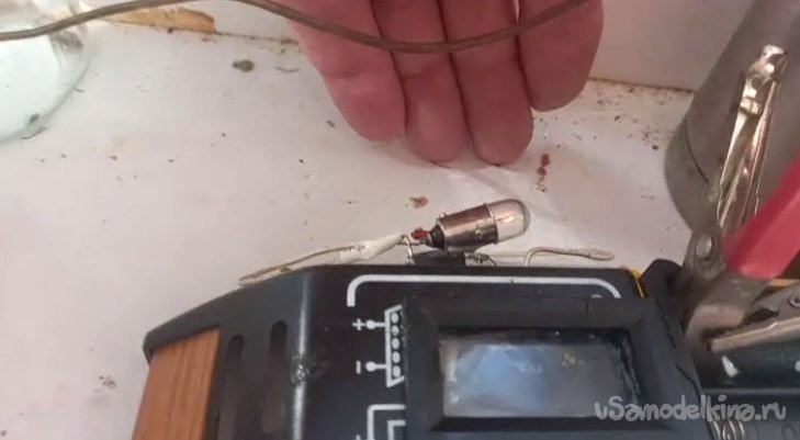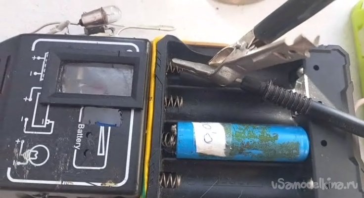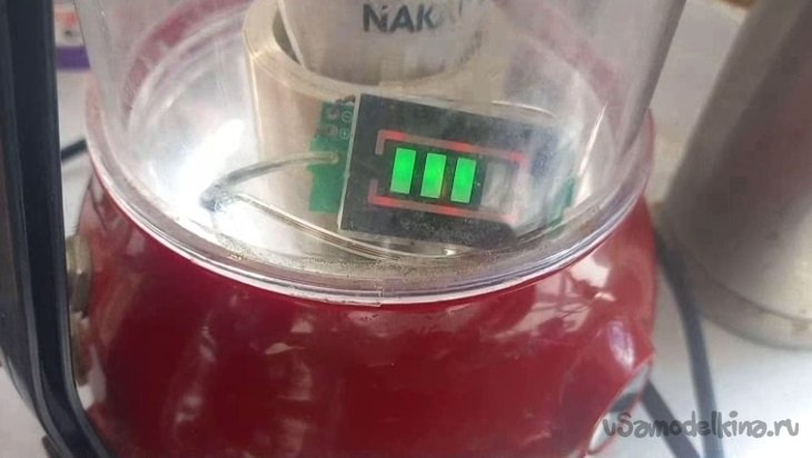 Подключил аккумулятор с напряжением четыре и два десятых вольта, вращая подстроечником зажег светодиод. Схема начала сбрасывать напряжение на балансир, лампа зажглась. Параллельно подключенному аккумулятору подсоединил разряженный аккумулятор. Напряжение просело, балансир отключился, лампа потухла. После отключения разряженного аккумулятора, заряженный аккумулятор восстановился, а схема снова включила балансир. Так, вроде и вторую задачу решил.