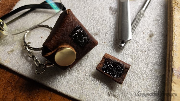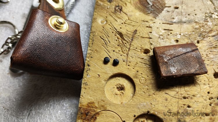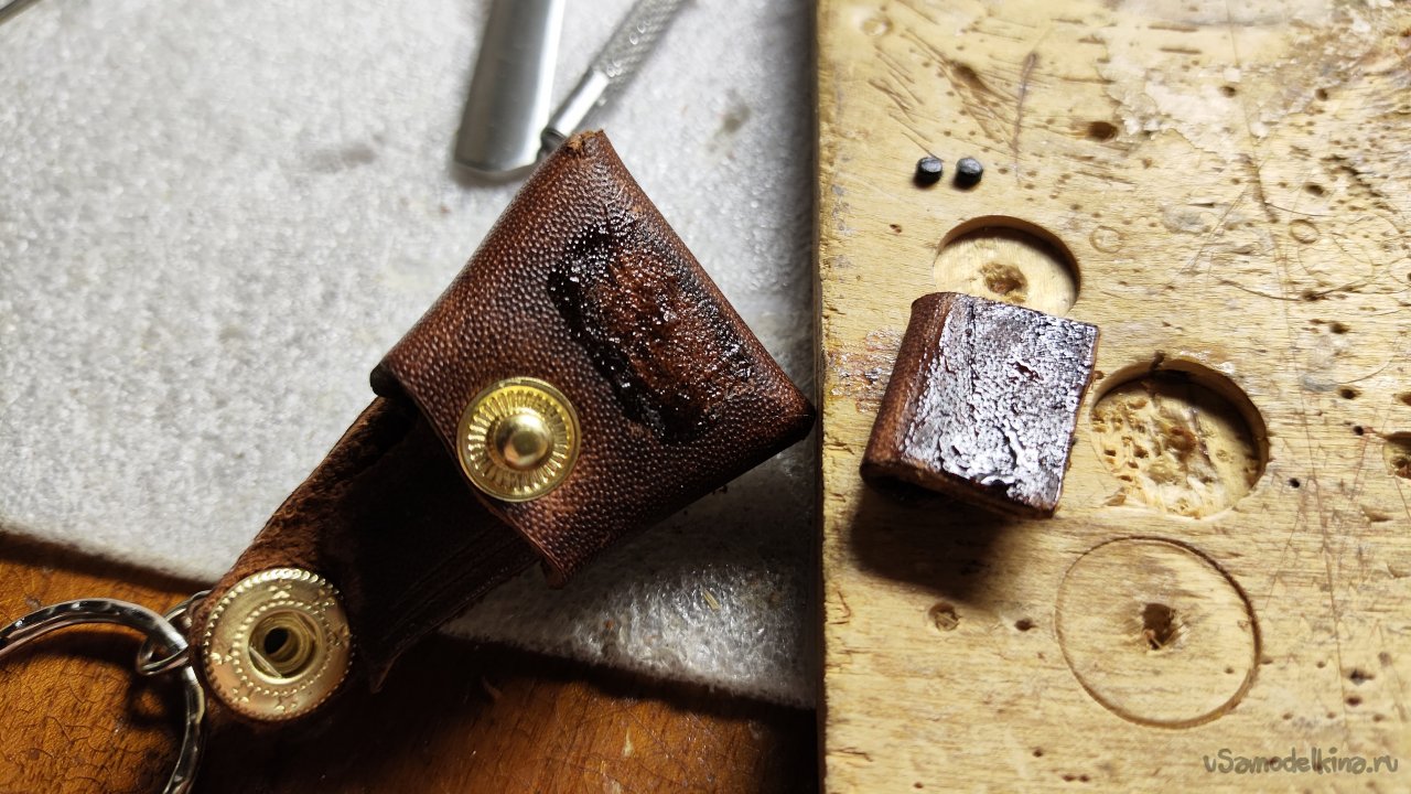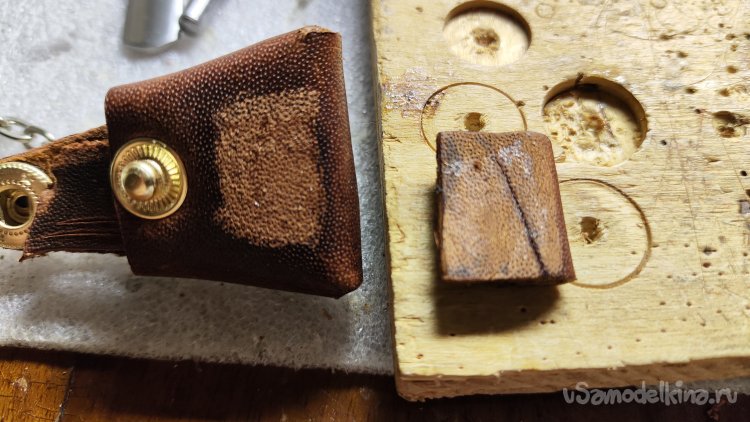 Кармашек приклеен. Справа на фанерке лежат кусочки кожи из высечки отверстий в черной коже маски. Ими будем делать имитацию кнопок на кармашке.