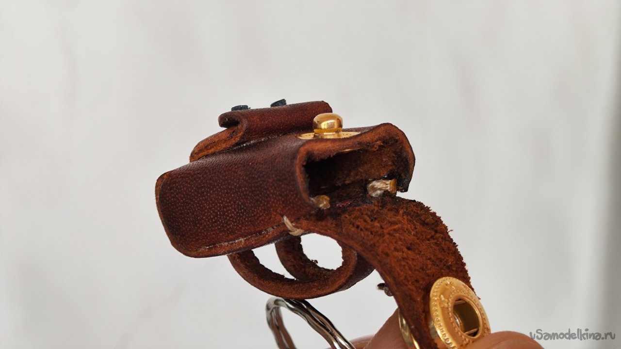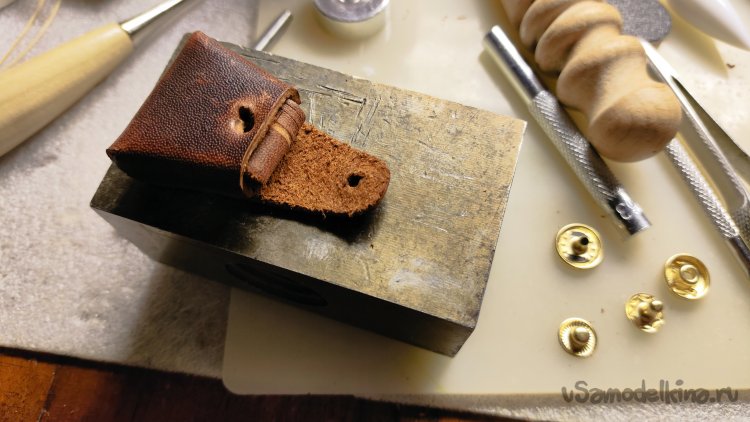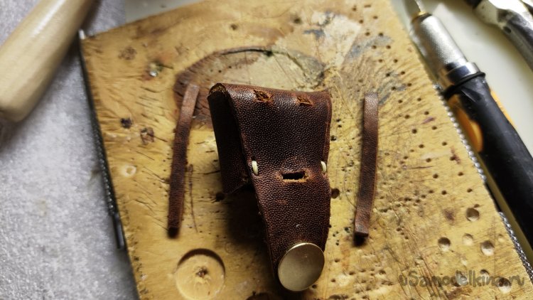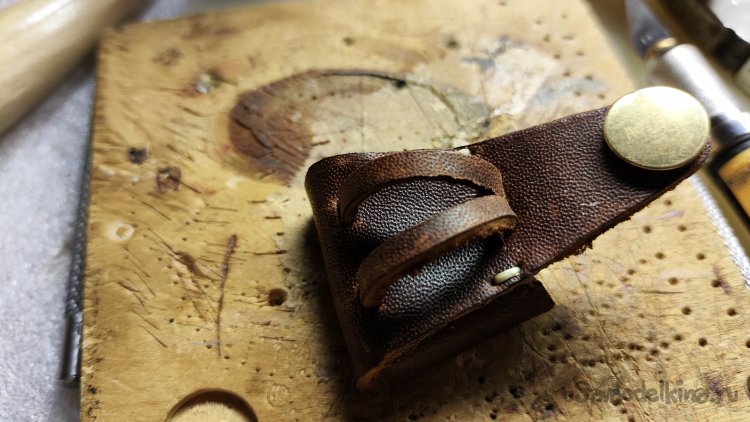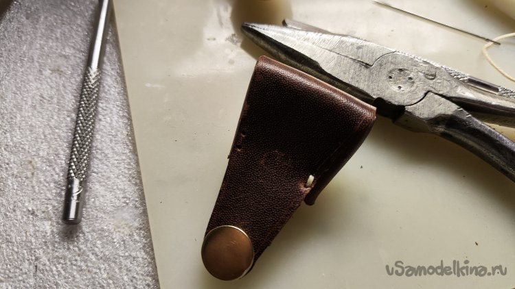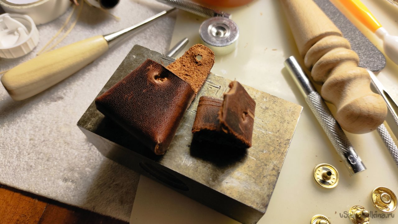 Отрезал полоски кожи на лямки. Прорезал маленьким резаком отверстия для лямок.