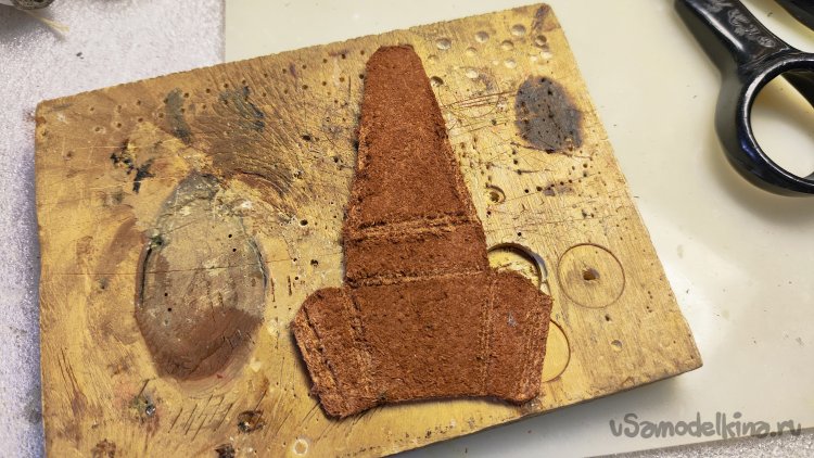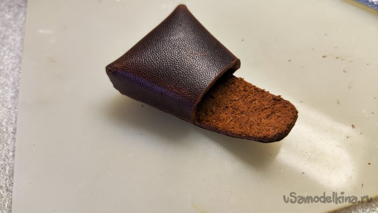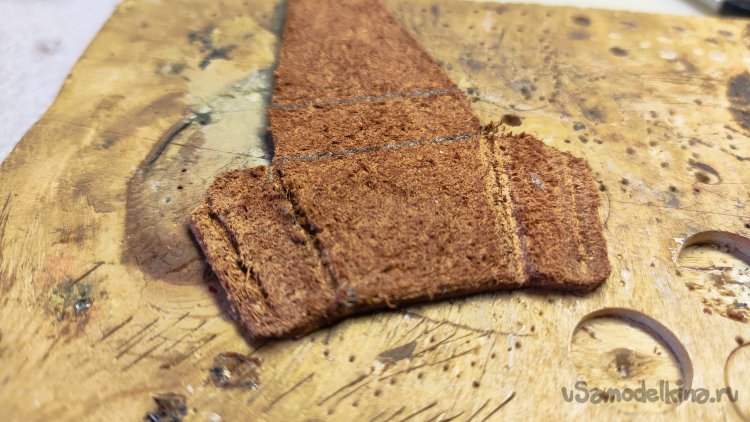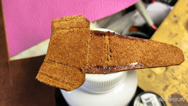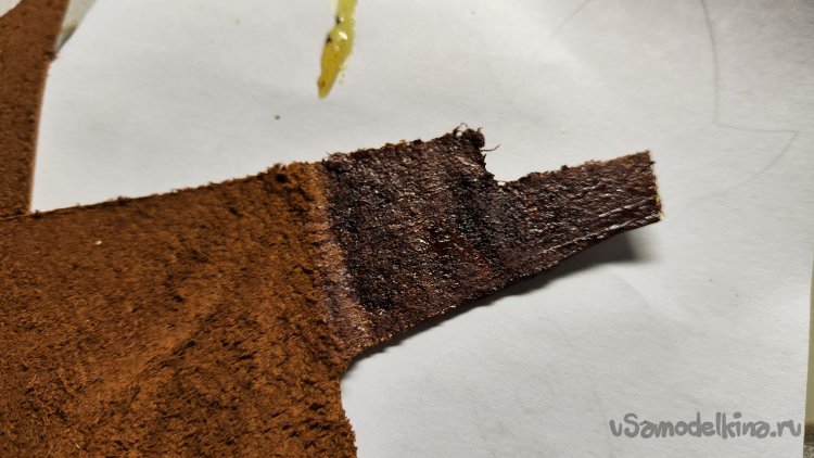 Намазал заготовку клеем. Кожа хоть и рыхлая, но клеем получается ее пригладить и рыхлость бахтармы не повлияет на конечный результат. Но это не точно