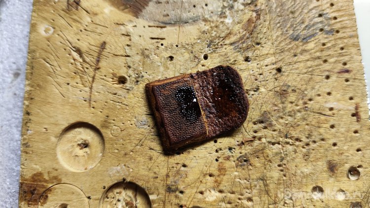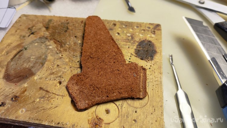 Рюкзачок интересный, но ему не хватает мелких деталей, кармашков, как на оригинале. А у меня нет такой тонкой кожи. Пришлось опять срезать бахтарму для уменьшения толщины. Покрываю срезанную кожу клеем. Высохнет клей и можно будет приступить к моделированию кармашек.