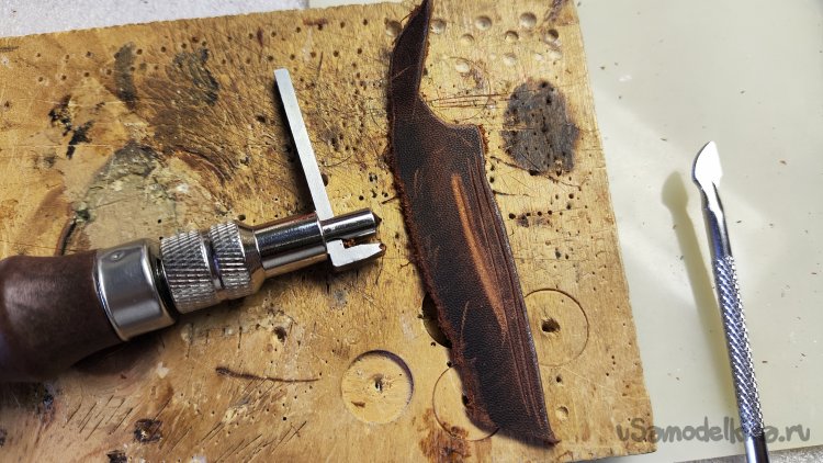 Достал из набора кромкорез. Заодно достал пару инструментов, которыми пока не пользуюсь. Один из них достаточно сложный и специфичный, для нарезания канавок. След от него на коже слева. Второй пока не понятно для чего. Он не сильно острый. Попробовал им нарезать канавки по краю кожи. Получается не очень, особенно с самого края. Два следа от него на коже справа.