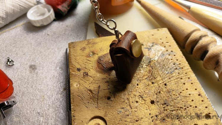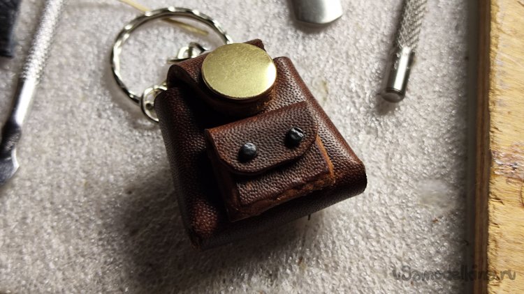 Для пробивания отверстия на корпусе пришлось вставить в рюкзачок кусок свернутого обрезка кожи. С первого раза не получилось ровно пробить отверстие, пришлось выравнивать.
