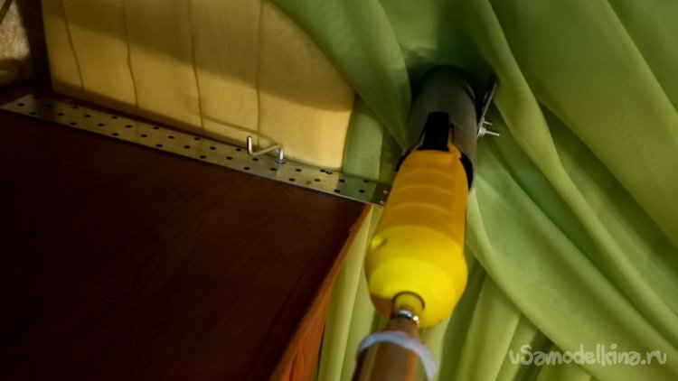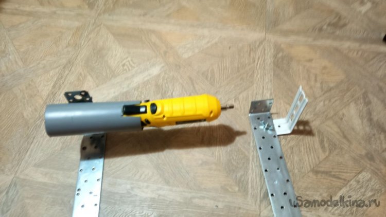 Подъёмно-опускной механизм. Основа его – шуруповёрт. Его надо как-то закрепить и прикрутить к валу-трубе, и сделать это так, чтобы осталась возможность менять направление вращения. Кнопка ПУСК, естественно, тоже должна быть доступна. Самый простой способ, по моему мнению, изготовить направляющую для шурика из сантехнической трубы Д50, остатки которой нашлись в кладовке. Пришлось сделать пропил для кнопки и насадить трубу на шуруповёрт, села плотно. Шлифуем заусенцы шлифмашинкой. Предварительно для дальнейшего использования изделия были просверлены отверстия в пластиковой трубе и к ней прикручен уголок. Левая часть попроще, просто уголок прикручен к длинному уголку. Далее, предварительно просверлив в длинных уголках отверстия такого диаметра, чтобы свободно проходила мебельная стяжка, монтируем левую сторону к потолку нашего шкафа. Правую пока немного собираем, чтобы длинный уголок имел свободу вращения. Далее вставляем левый шток Изделия в левый уголок, и постепенно выставляем в одну плоскость шуруповёрт и правый шток. Когда они будут полностью сосны (понадобилось несколько попыток точно подогнать длину), затягиваем мебельными стяжками длинные уголки. Я ещё для надёжности пару саморезов всадил, но жене об этом знать необязательно. Изделие готово! Можно приступать к тестированию. Ближайшие планы – сделать дистанционное управление экраном. Звуки воспроизводятся музыкальным центром посредством подключения «джеком», несколько лет назад я протянул провод от телевизора к акустике.