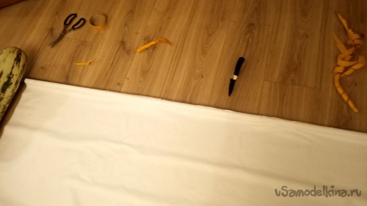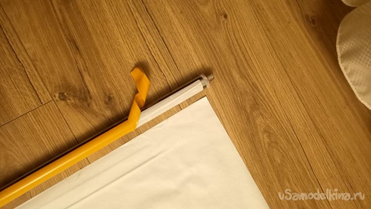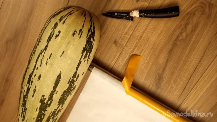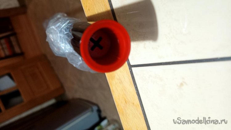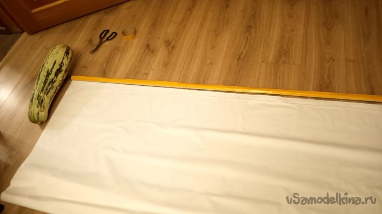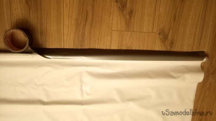 Приклеивание экрана к трубе. Сложный этап, учитывая, что я работал без помощников. Вместо них использовал кабачок, он хоть как-то держал трубу на месте. Двухсторонний скотч наклеиваем на обезжиренную (шутка, я не такой маразматик) трубу и потом возможны два способа. Я сделал так: чуть приоторвал защитную плёнку скотча справа и слева, прижал клеёнку по краям, предварительно натянув, и потом постепенно стал вытягивать плёнку, одновременно приглаживая клеёнку лицевой глянцевой стороной к трубе (в Интернете наверняка есть этот способ, на тему «Как приклеить ветровики на автомобиль»). Второй способ мне пришёл в голову позже, поэтому не проверен. Распрямляем клеёнку, на трубу приклеиваем двухсторонний скотч, отрываем защитную плёнку и ловко и ровно прижимаем трубу скотчем к клеёнке. В любом случае сверху потом надо приклеить плотный серебристый скотч.