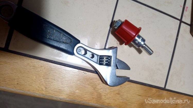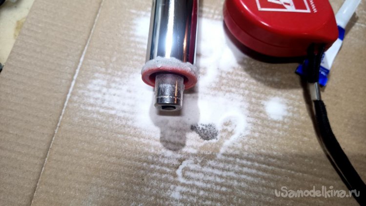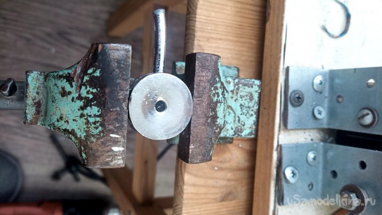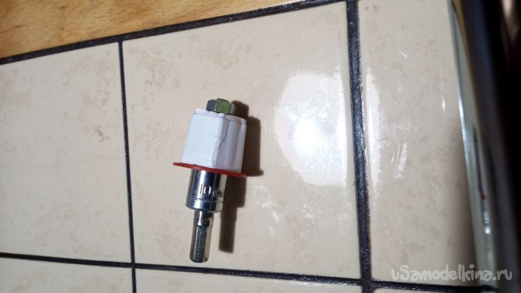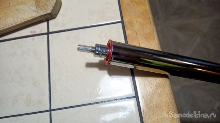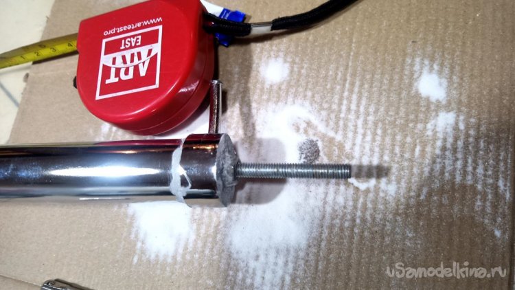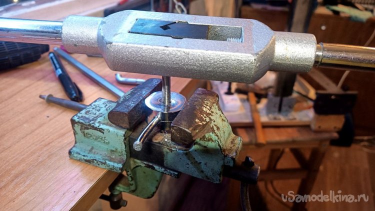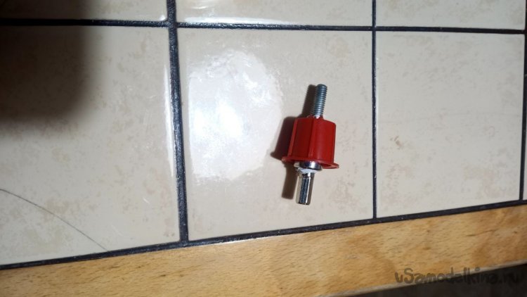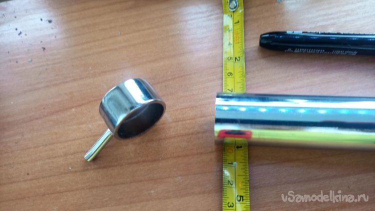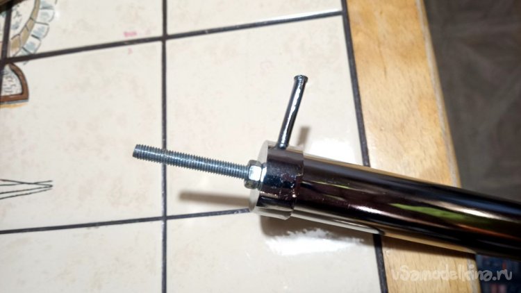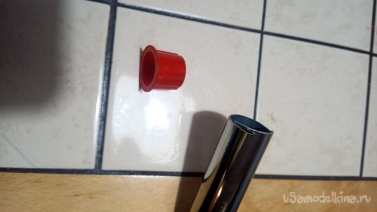 Из всего увиденного в том же магазине мне больше всего понравилась хромированная труба Д25 длиной 3 метра и ценой 785 рублей. Отпиливаем болгаркой лишнее и размышляем, как её заставить крутиться. Спереди и сзади надо придумать оси. Левая ось может просто находиться в какой-то опоре, а правая должна быть такой, чтобы можно было туда прикрутить привод от шуруповёрта. Попалась на глаза мебельная заглушка сломанная, на таких крепятся рейлинги на диванах (по крайней мере у меня так). Внук эти релинги дёргает и весом наваливается, они и ломаются частенько. Как человек запасливый, я их не выбрасываю, вдруг когда пригодятся. И вот настал их звёздный час. Зажимаем в тиски, просверливаем отверстие и нарезаем резьбу. Можно было и болтиком прижать, но решил научить сына нарезать резьбу в металле. Эта заглушка идеально плотно села на трубу, но потом всё равно приклеим их суперклеем с содой. На приводную часть я решил использовать другую систему. На глаза попалась транспортировочная заглушка от аккумуляторной батареи для автомобиля. Она тоже почти идеально села на трубу, немного белой изоленты нам в помощь. Болт под 10 ключ с гайкой и шайбами подошли идеально. А переходник 4-гранник/6-гранник отлично сопряжёт наш шуруповёрт с трубой. Снова заклеиваем всё суперклеем с содой.