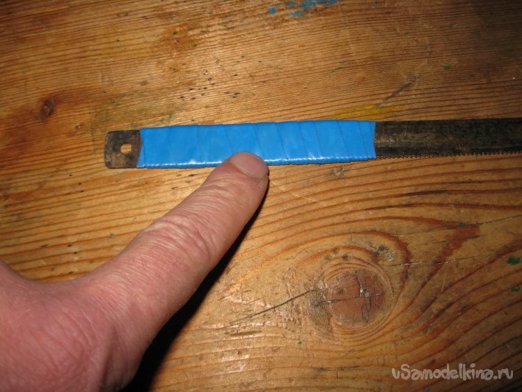 Поэтому для изготовления данного инструмента, ножовочное полотно нужно лишь слегка доработать, например, сделать на нем ручку из изоляционной ленты.