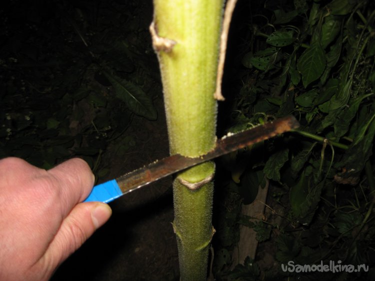 Кроме того, даже если под рукой есть большой нож, им не всегда можно воспользоваться из-за того, что для перерубания толстого стебля нужно пространство для замаха, а его зачастую может и не быть, особенно если несколько растений растут очень скученно, а нужно перерубить только одно растение.