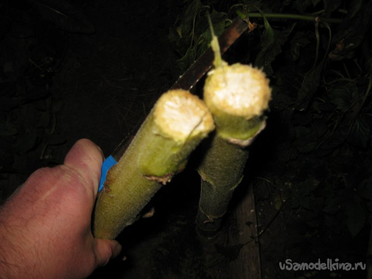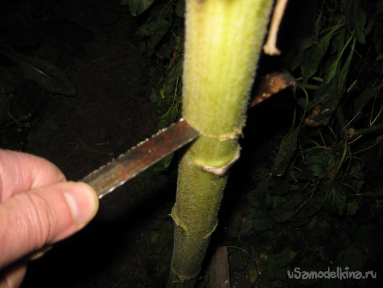 Для наглядности, опробуем этот инструмент в деле. Для примера, перепилим им толстый стебель подсолнечника.