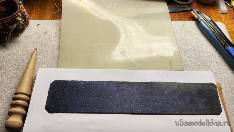 После просушки белый грунт стал практически прозрачным. Закрашиваю торцы черным Токонолом. На фото видно слева грунт, справа Токонол.