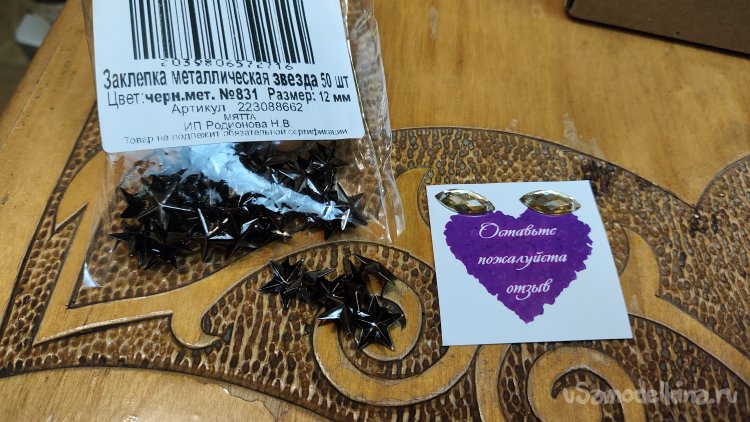 Заказал на WB разной фурнитуры для украшения браслета. Со звездочками немного промахнулся. На фото они были стального цвета, а в описании и по факту оказались темные, крашенные. Но все равно забрал, пригодятся.