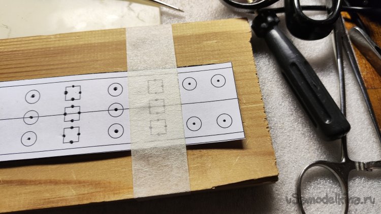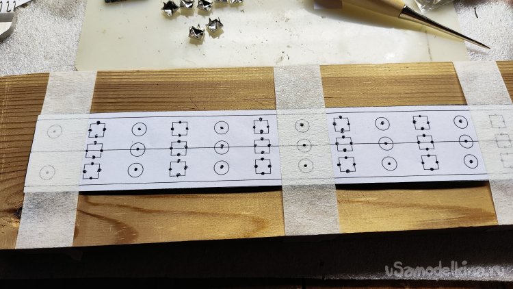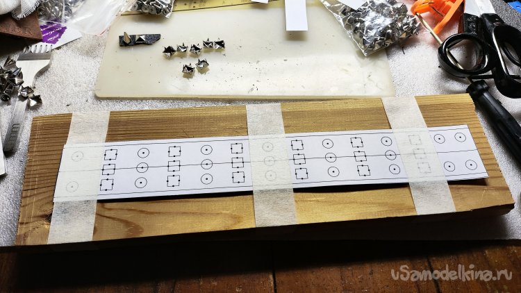 Первые два варианта 15 мм между центрами, все же показались очень плотными , поэтому выбрал третий вариант, 20 мм между центрами. Вырезал разметку, малярным скотчем прижал ее к полосе кожи.