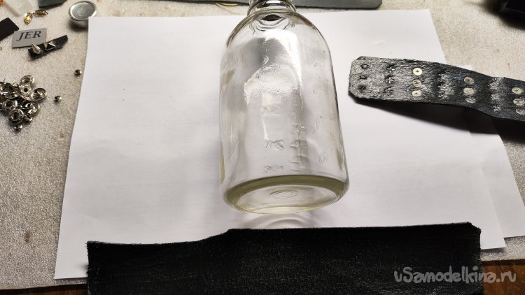 Для радиусного склеивания, чтобы внутренняя поверхность кожи не мялась, воспользуюсь поллитровой медицинской бутылкой.
