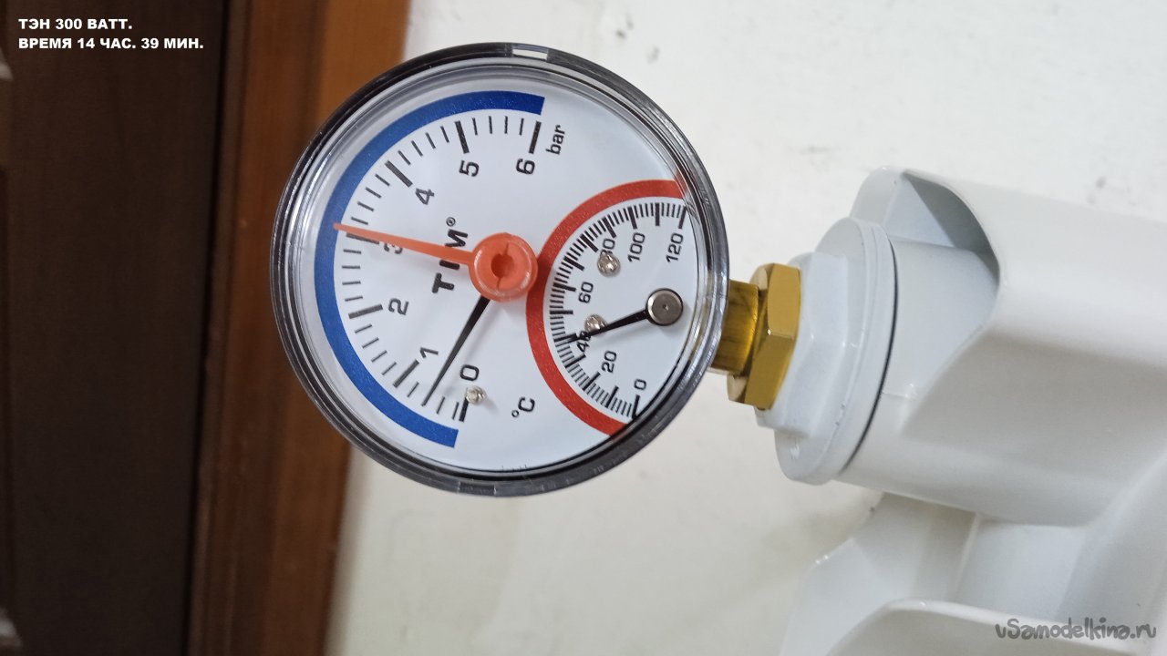 (сильно удивился). Температура и давление начали расти очень быстро (это легко сказано). Давление вместе с теплоносителем травил несколько раз (манометр начинал «зашкаливать»). Менее часа потребовалось, чтобы «самовар вышел» на рабочий режим, при выставлении термопары на 60 градусов по Цельсию. Выше температуру поднимать не стал и этой достаточно. На этом эксперименты и работу закончил, посчитав что «самовар» готов к эксплуатации.