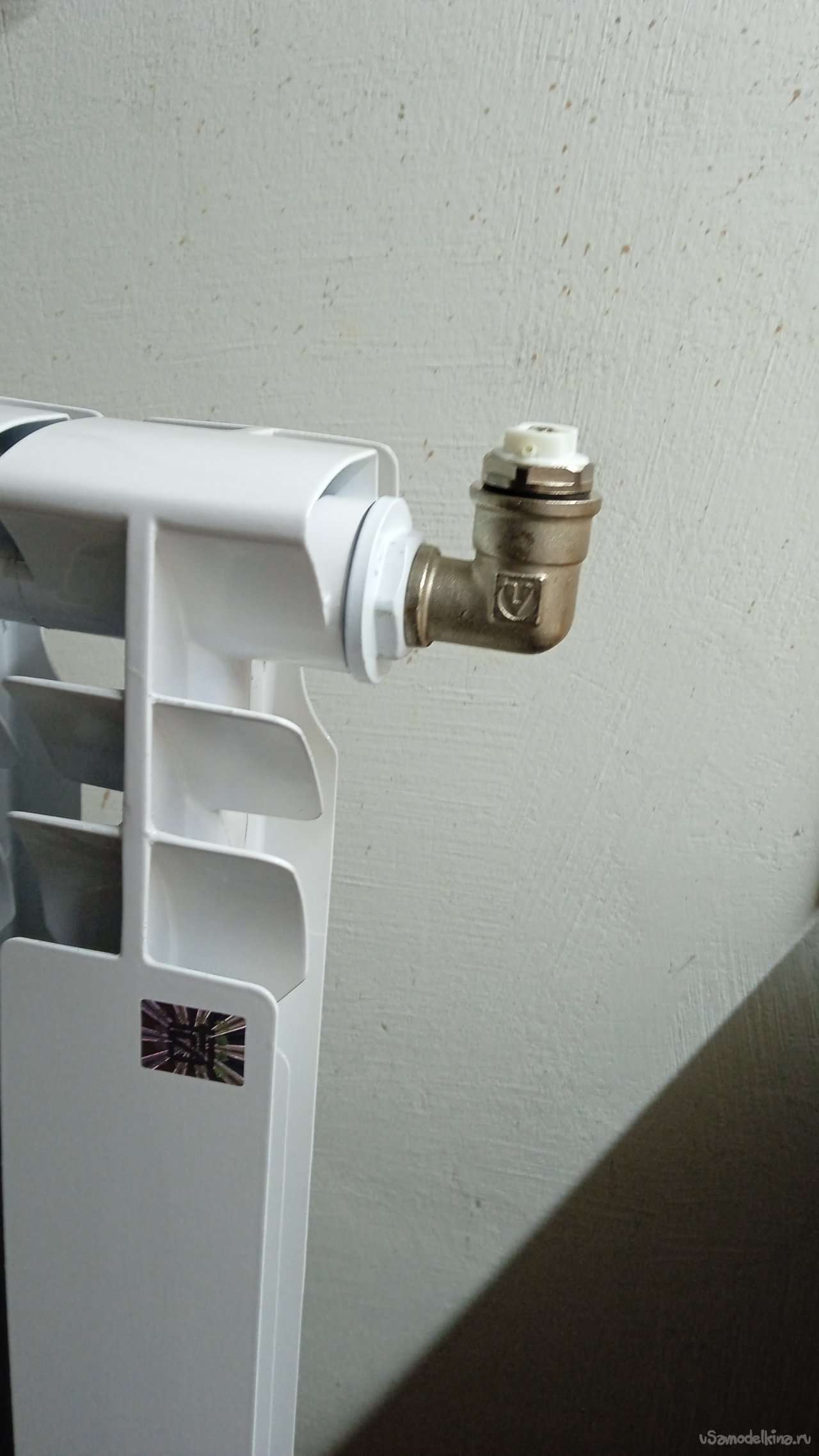 Для удобного залива теплоносителя, в верхней части радиатора, закрутил сантех уголок на 90 * (гайка – штуцер), а в него пробку с краном Маевского, для стравливания давления.