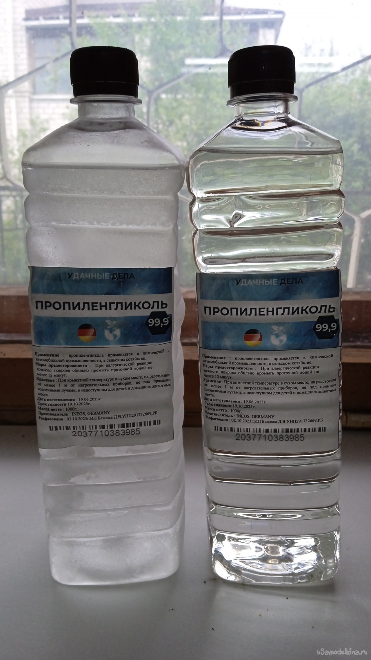 Оказалось, что применение вышеуказанного, достаточно обширное, даже в пищевой промышленности используют. Можно разбавлять водой, для увеличения литража, но температура замерзания будет выше (по шкале). Провел эксперимент, на предмет замерзания, положил одну бутылку в морозилку на ночь, а утром сравнил. Не замерзает, а превращается в желе образную жидкость, по консистенции как кефир.