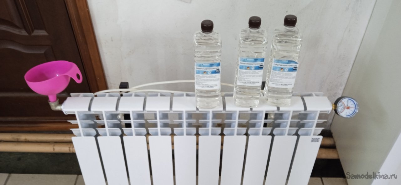 По совету мастеров, которые занимаются системами отопления, купил три литровые бутылки «Пропиленгликоля», его использовал, в качестве теплоносителя.