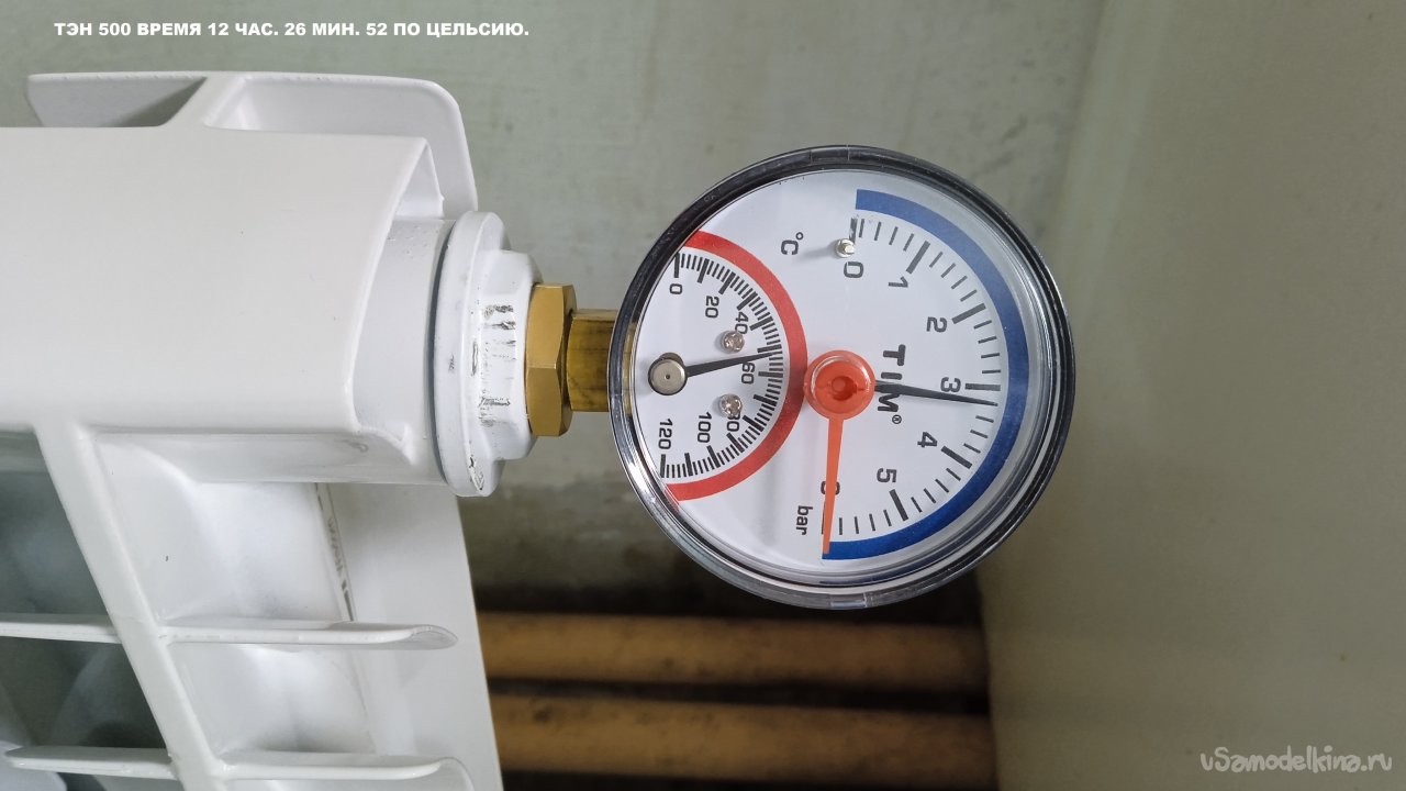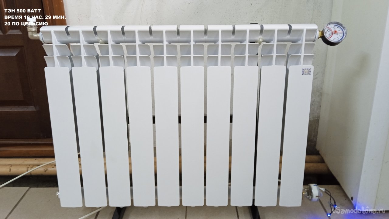 Залил в радиатор воду, в качестве теплоносителя, для первого тестового пуска. Заливал мерной кружкой, чтобы понять, сколько нужно будет покупать морозостойкого теплоносителя в дальнейшем. По количеству, получилось около 3-х литров воды, почти как по таблице, в колонке 500\80. Подключил к сети и попробовал выставить настройки термопары в районе 60 градусов на отключение. И вот оно – первое разочарование…. ТЭН на 300 ватт, не разогревает воду, в десяти секционном радиаторе, более 40 градусов по Цельсию. Получается такая «картина», что мощности 300 ТЭНа, хватило бы на секций 6, для нормальной работы. Меня это не остановило и «для второго шага», заказал ТЭН на 500 ватт, продается как единичное изделие, без термопары (посадочные одинаковые).