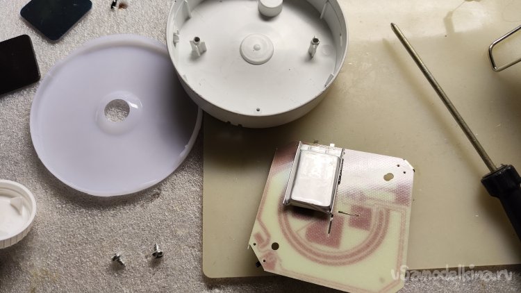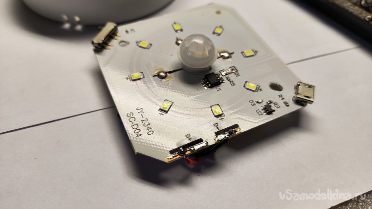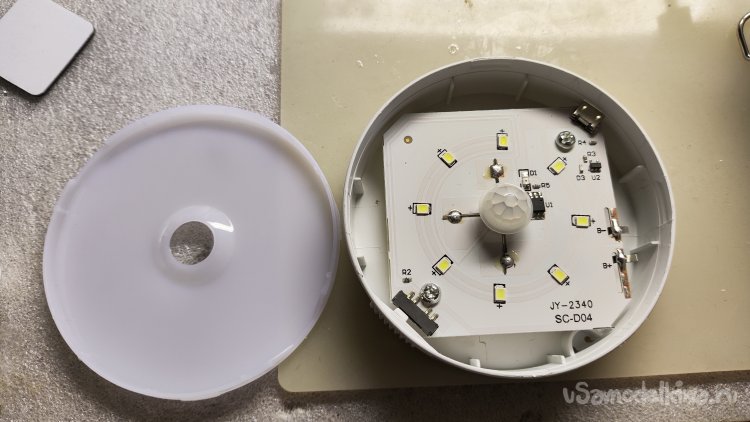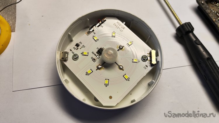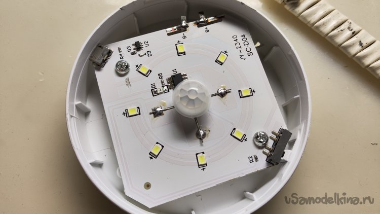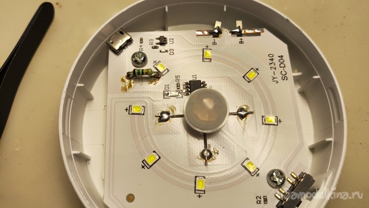 Разбираю светильник для ознакомления с конструкцией. На плате восемь светодиодов, контроллер, датчик движения, ИМС контроля заряда.