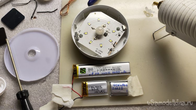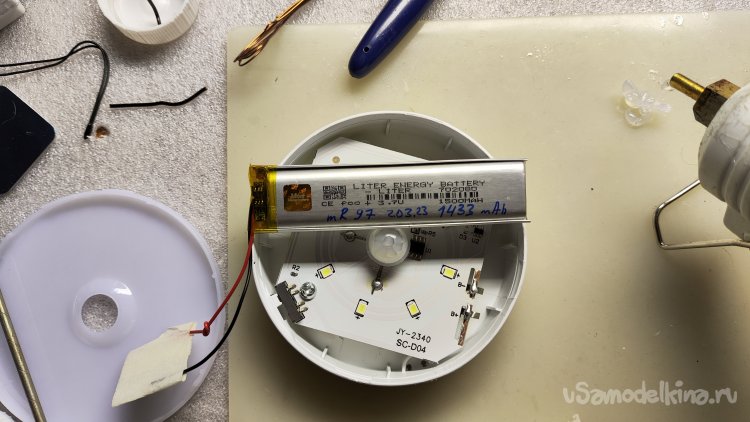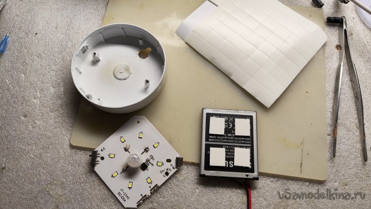 Разбираю светильник. К новому аккумулятору припаиваю провода, наклеиваю вспененный скотч.