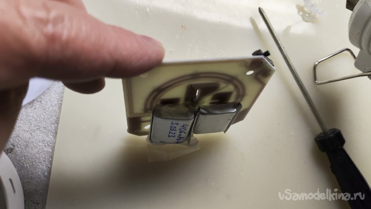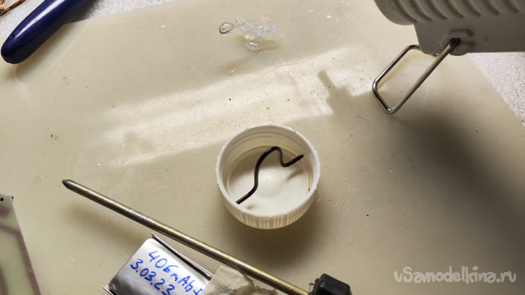 Приклеиваю аккумулятор к плате, укорачиваю провода по месту и припаиваю их.