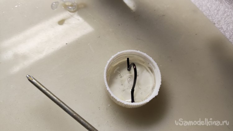 Для крепления на кухонную люстру изготовил держатель железной пластины из пробки и куска проволоки.