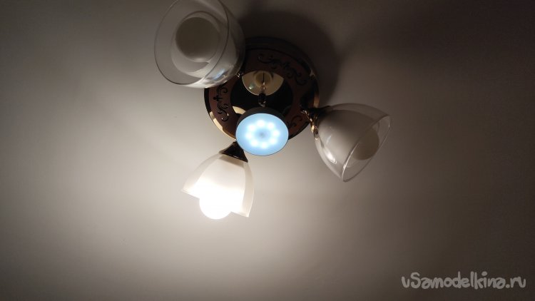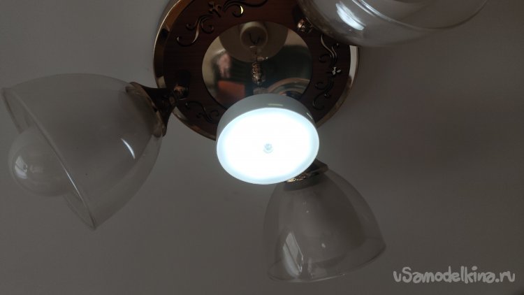 Установил светильник на люстру. Аккумулятор здесь меньше и легче, чем в коридорном, магнит держит хорошо.