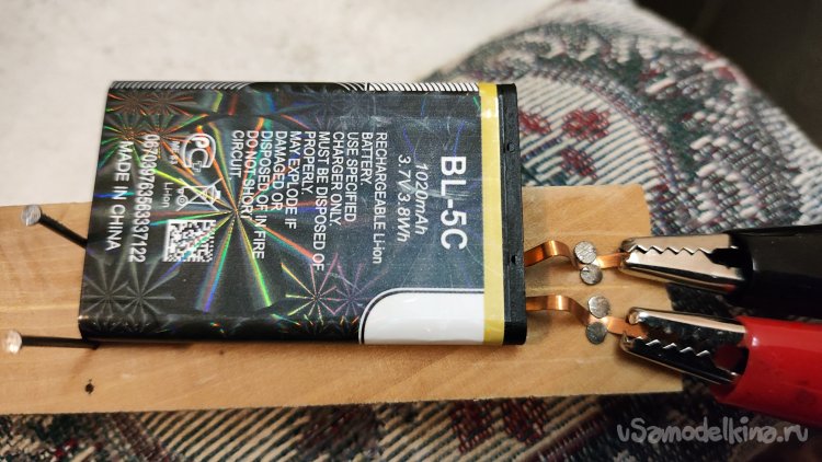 Поменял провод на аккумуляторе, чтобы было легче прицепить крокодилы зарядки. Так же припаял провод на аккумулятор от мобильного телефона.