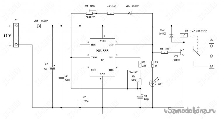 Для реализации проекта была использована достаточно простая схема на основе ИС универсального таймера NE555.