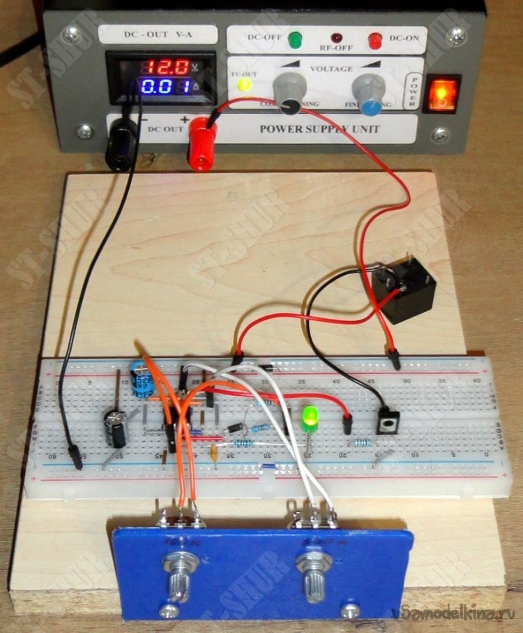 Для проверки работоспособности и подбора времязадающих элементов (R1, R2, R3, R4, C4), схема была собрана и протестирована на макетной плате.