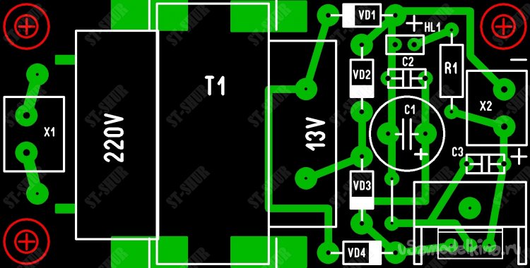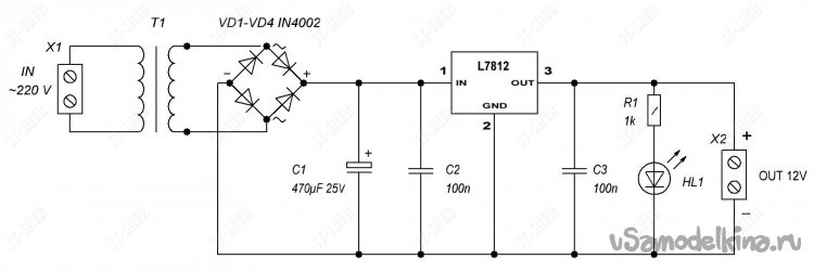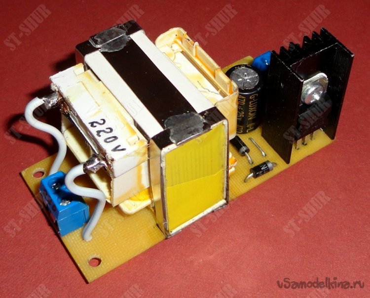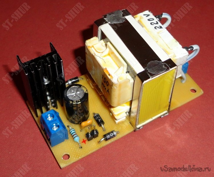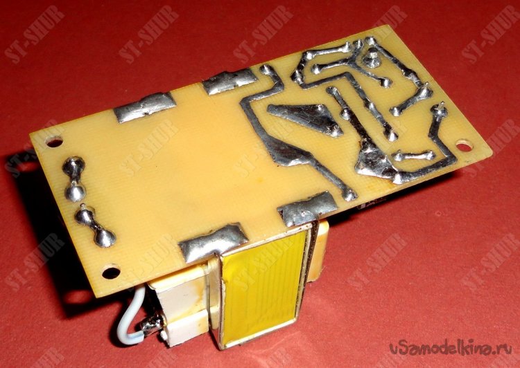 Модуль простого стабилизированного блока питания (12В, 150-200мА), собран на односторонней печатной плате размерами 36х71мм. Трансформатор зафиксирован на печатной плате с помощью обрезков никелированной ленты, предназначенной для сварки ячеек АКБ.