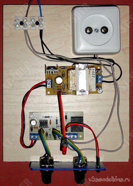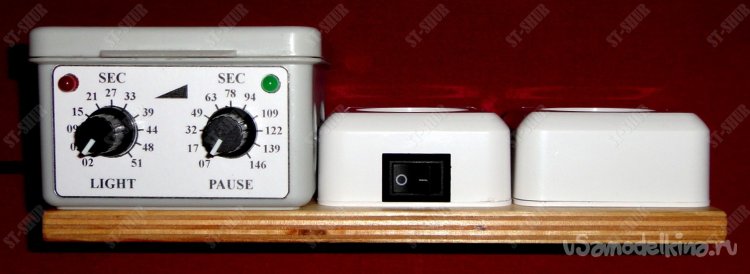 Далее элементы конструкции были закреплены на обрезке фанеры размерами 208х75х10мм. Сетевой провод подключается с помощью клеммной колодки (расположенной в обрезке черной пластиковой трубки). Через выключатель «KCD1» сетевое напряжение подается на БП таймера.