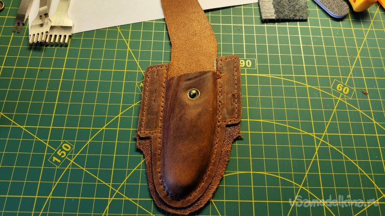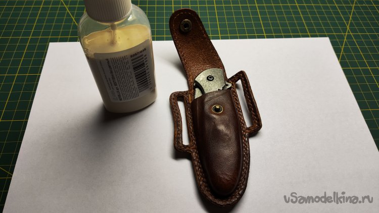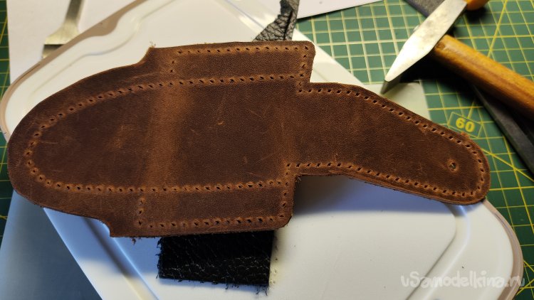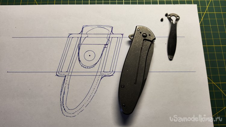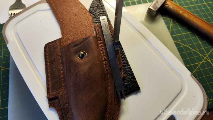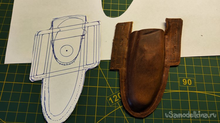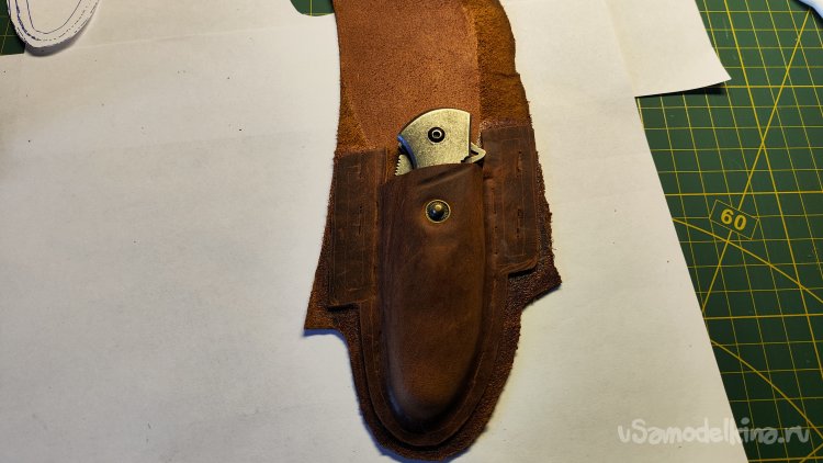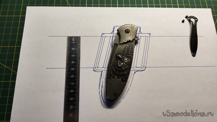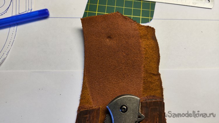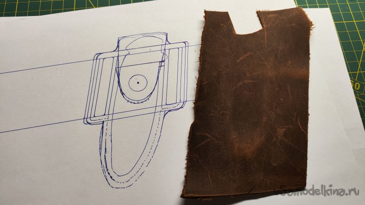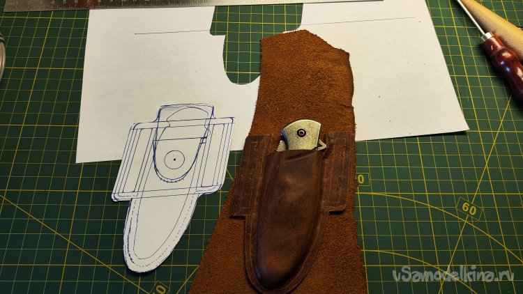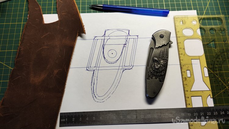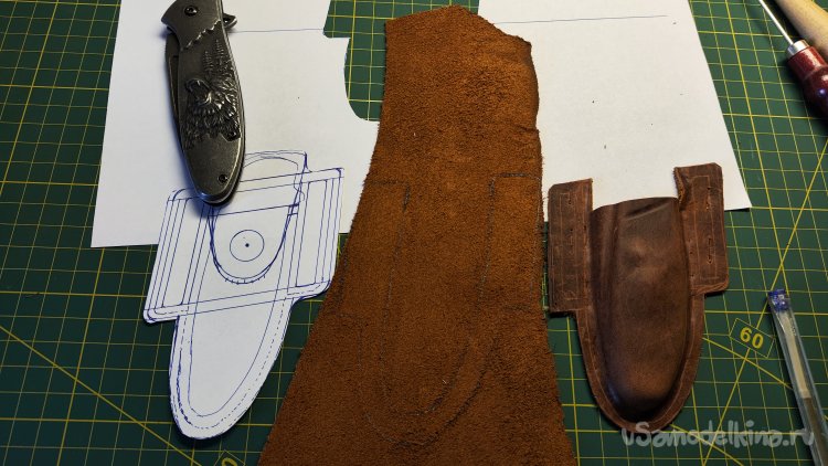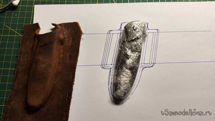 Выкладываю эскиз и нож, убираю лист, накладываю кожу, лист сверху. Можно шилом обводить контур чехла.