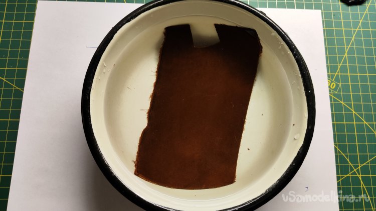 Замачиваю кусок кожи в воде. Намокает не очень, видно кожа пропитана маслом и/или воском.