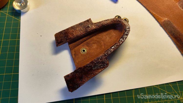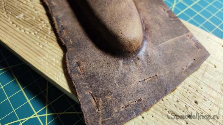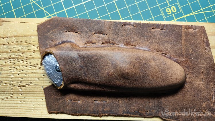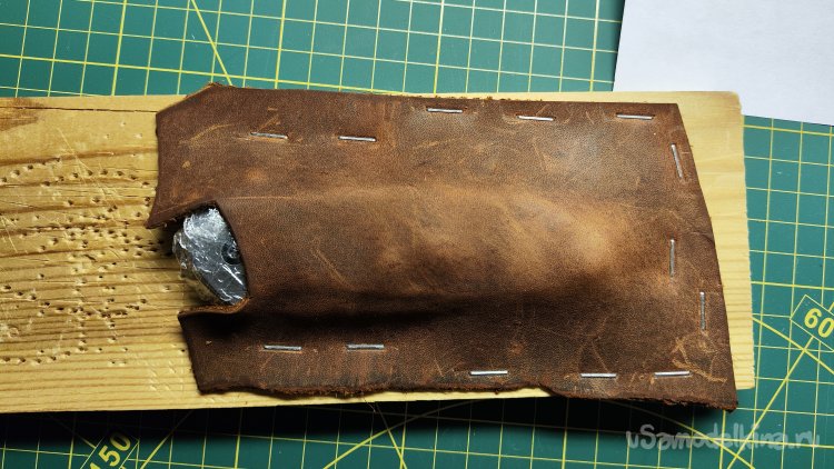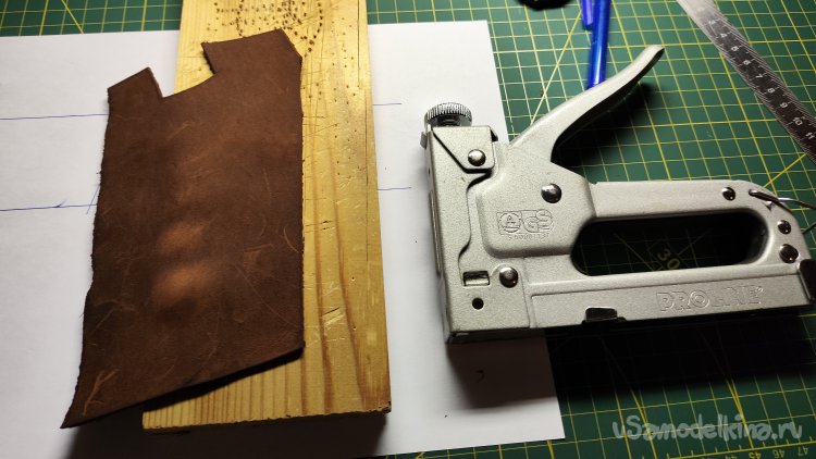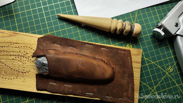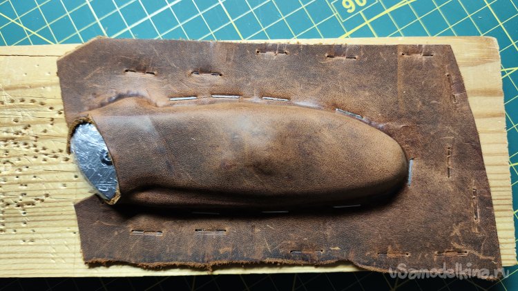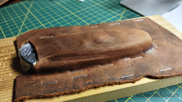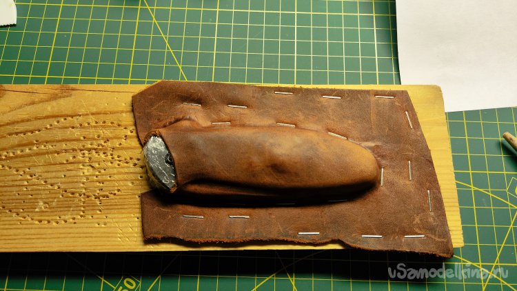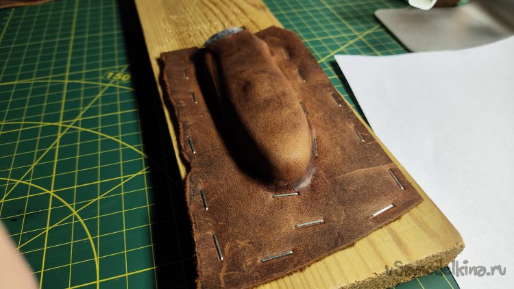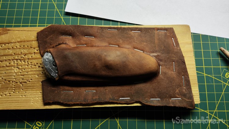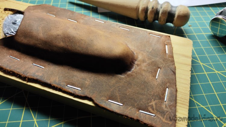 Фиксирую скобами кожу по периметру ножа. Формую сликером верхнюю поверхность и оставляя кожу сохнуть на несколько часов.