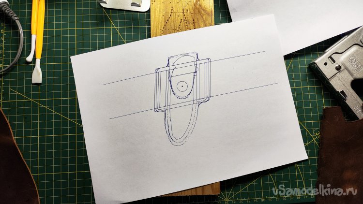 На листе бумаги рисую пару параллельных линий на расстоянии 48 мм, ширины офицерского ремня, на который будет вешаться чехол. Прикладываю сложенный нож и обвожу его. Рисую контуры чехла, линии прошивки и т.д.