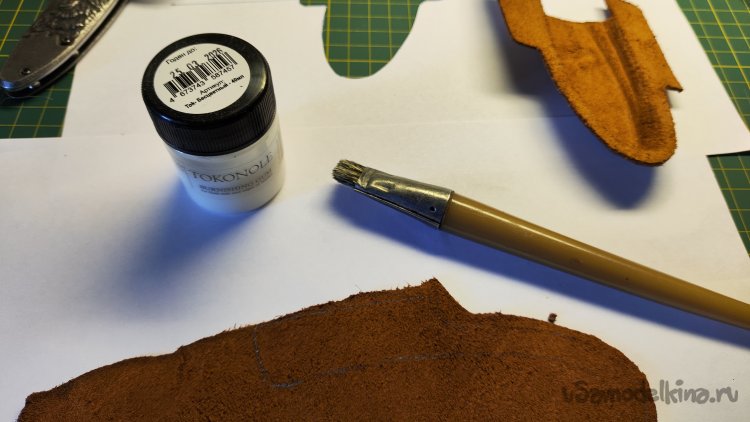 Обвожу на нижней части контур верхней части. Прорисовываю контур ножа, чтобы при склейке знать, куда наносить клей, а при нанесении на кожу закрепляющего слоя токонола, не наносить его на место склейки.