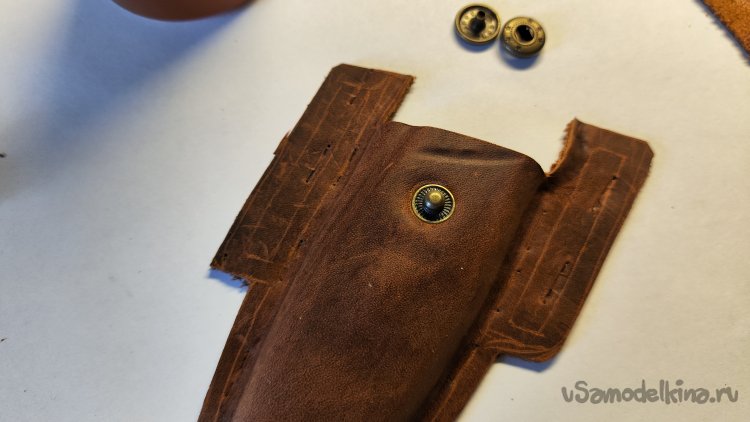 Закрыл клапан и прижал кожу к кнопке. Отчетливо видно место установки. Это очень хорошо, не придется мудрить, как отметить место пробоя отверстия.