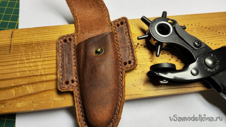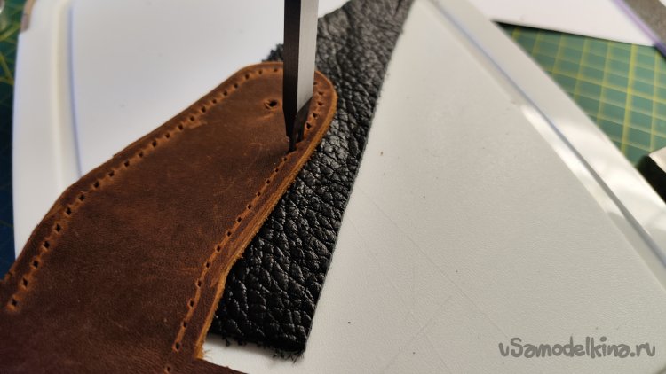 После пробития отверстий прижимаю кожу одним из пробойников, чтобы было удобнее вытаскивать пробойник из отверстий. Вытаскивается достаточно туго.
