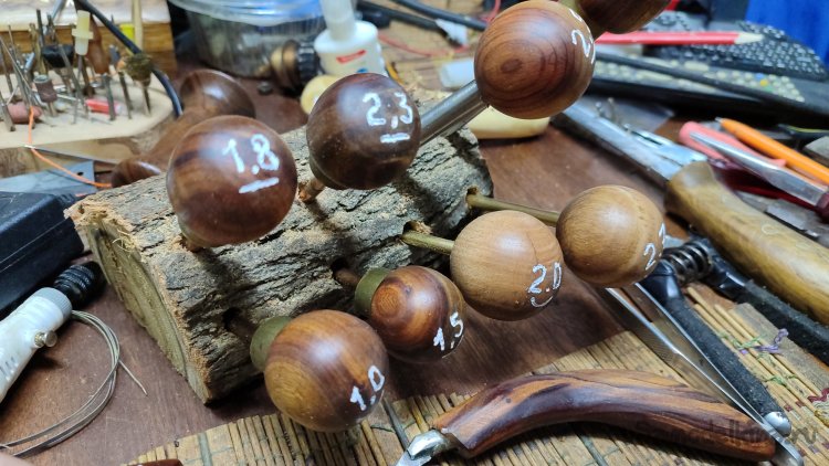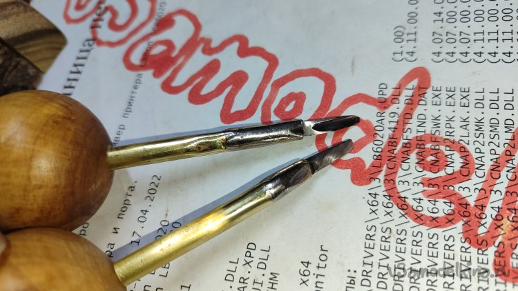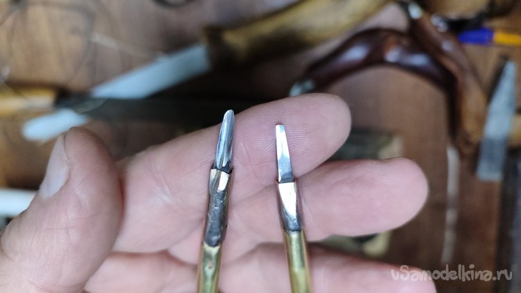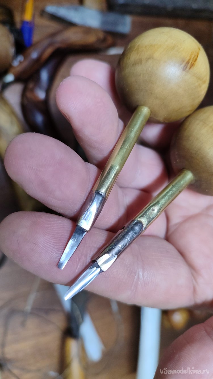 Сделал что задумал, по ходу выполнения работ сделал ещё один резец из самокала с радиусом закругления 2,7 мм, и тоже с углом в 11 градусов. Не выкрашивается даже при инкрустации самшита. Но с оговоркой, я ведь втыкаю его, а не режу вскользь или на отжим. На рукоятки выжигателем нанёс размеры и обозначил форму резца, на эвкалиптовых рукоятках замечательно видно, а вот на рукоятках из камфорного лавра плохо, дерево тёмное, видимо придётся заполнять краской цифры.