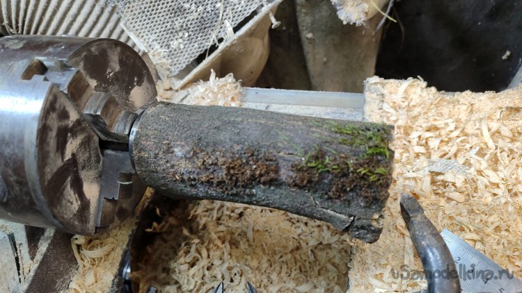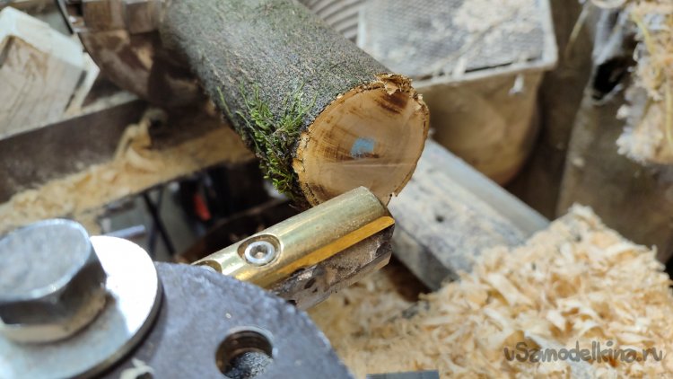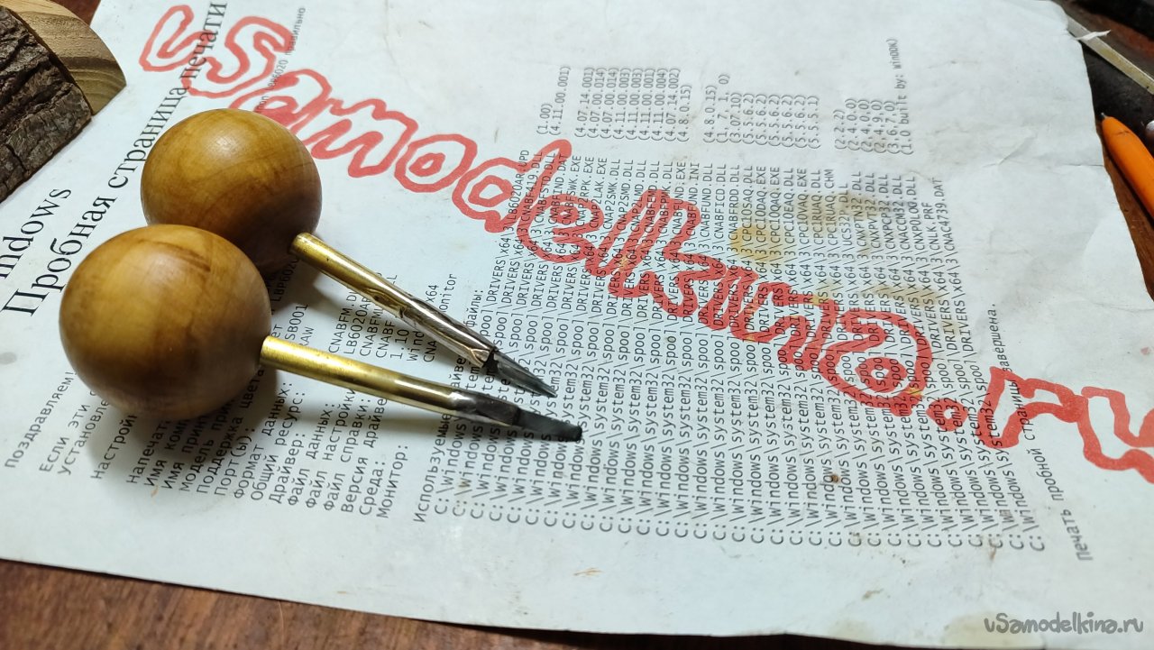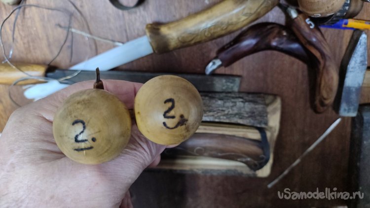 Точил рукоятки на самодельном токарном станке с оснасткой. Просто перпендикулярно патрону закрепил в резцедержатель оправку с патроном от дрели и зажал в нём цилиндрическую фрезу по дереву предварительно сняв направляющее центральное сверло. При одновременном вращении оправки которую я крутил дрелью и при включенном вращении токарного патрона, довольно просто точатся шарики по размеру коронки. Но много надо шлифовать после такой проточки, зубья у фрезы большие, и они оставляют глубокие следы.