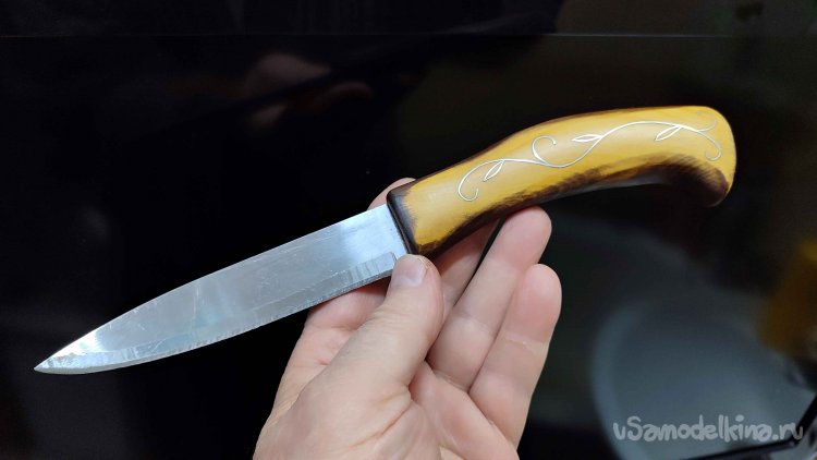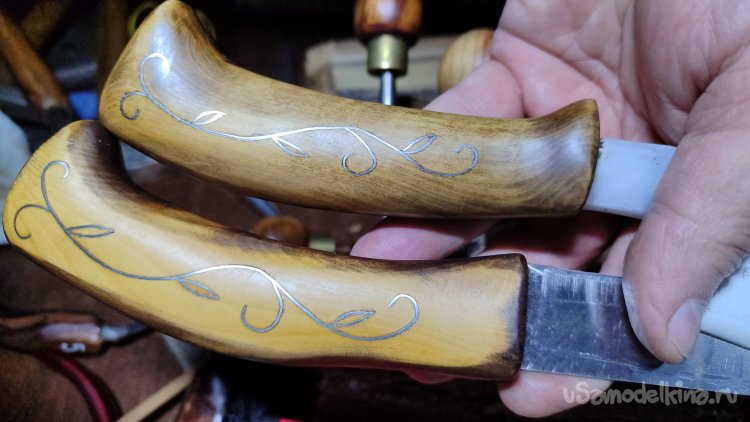 Всё это делалось при выполнении инкрустации нейзильбером по самшиту. Рукоятка ножа простенько смотрелась. Поэтому решил украсить таким способом. И вот что получилось.