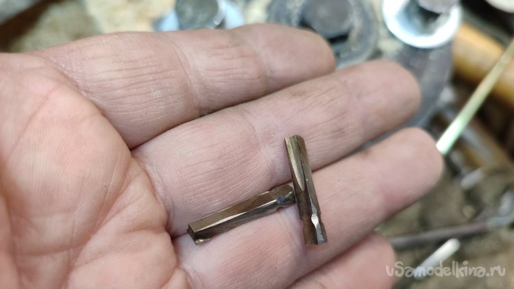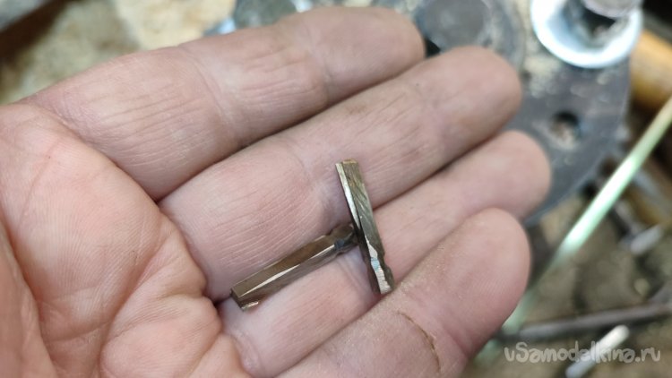 Для резца нет необходимости использовать сталь более чем необходимо для самой режущей части, поэтому отрезаю маленькие куски высококачественной марки и вставляю в державку.