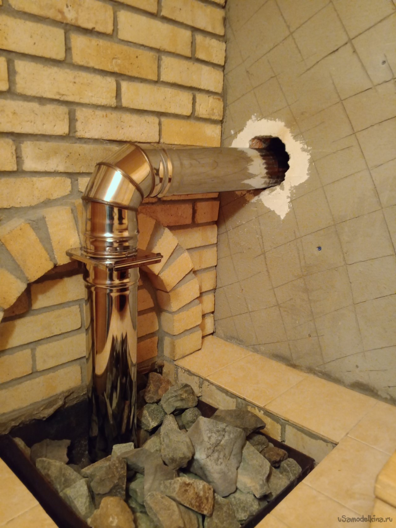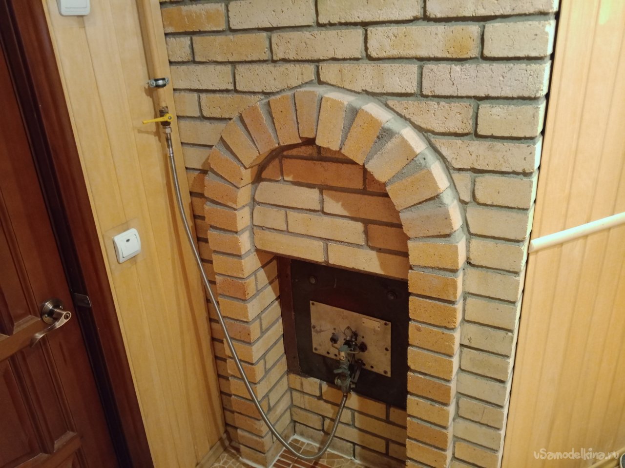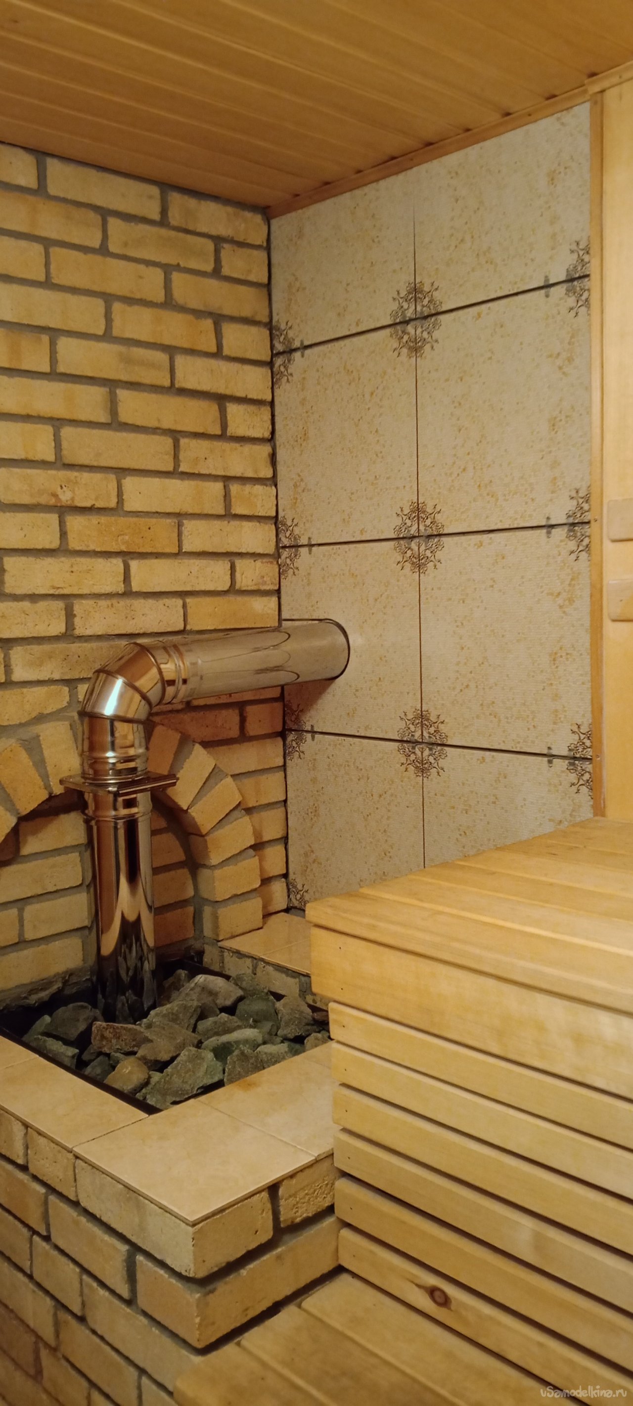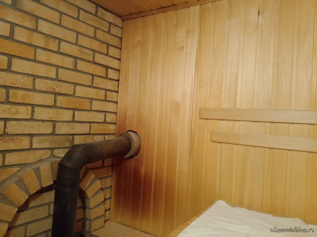 Сауна располагается в доме, отдельным помещением, используется в основном в зимний период. Печь работает на газе, стационарно подведенного газопровода. Газоход в шахту вентиляции, угловая наборная труба 120 мм. с поворотным шибером. Стена капитальная.