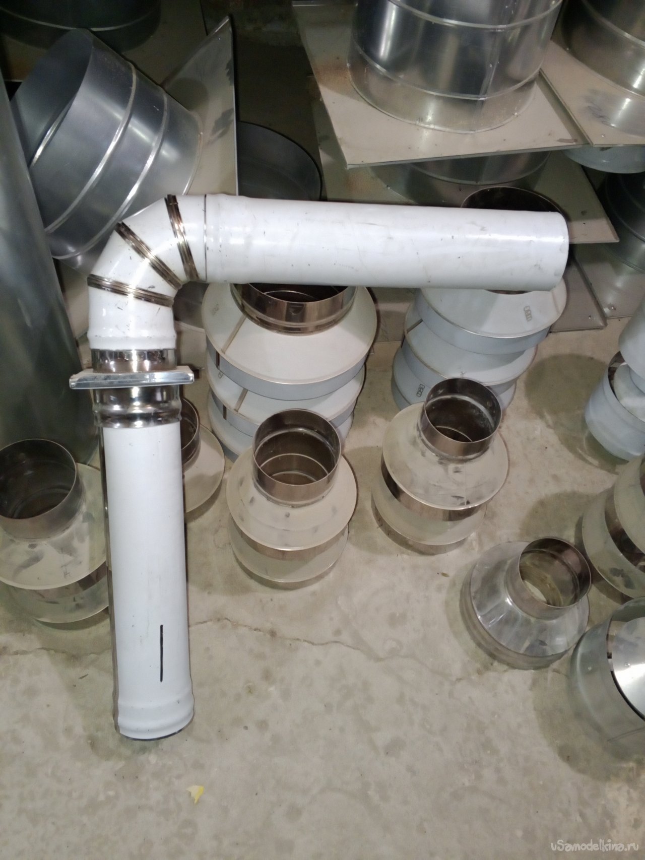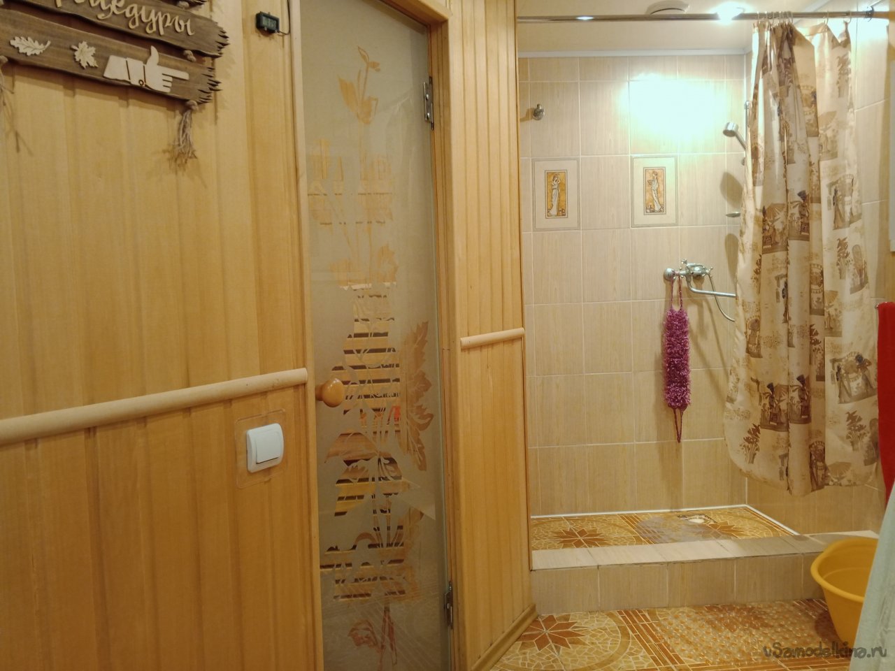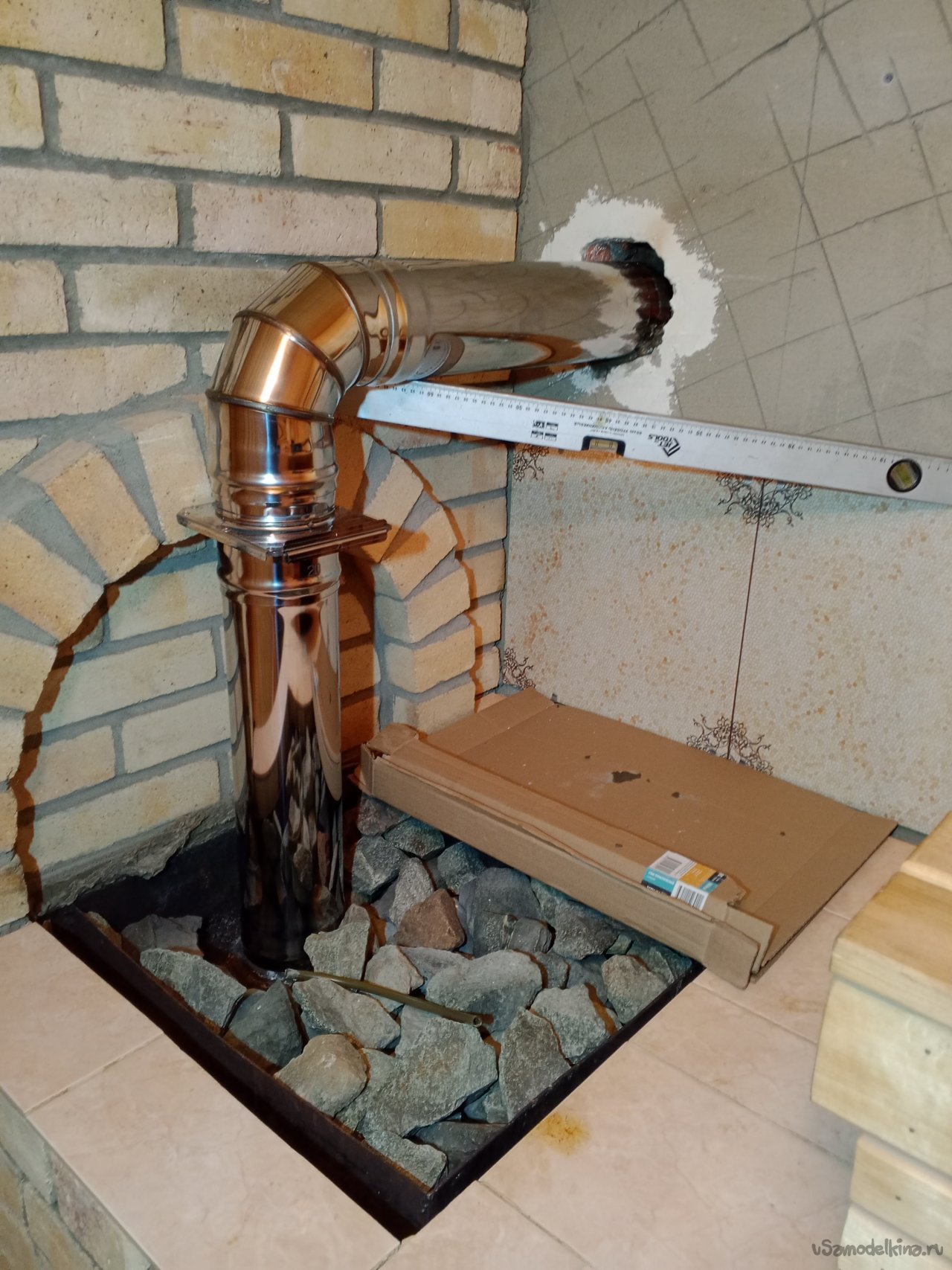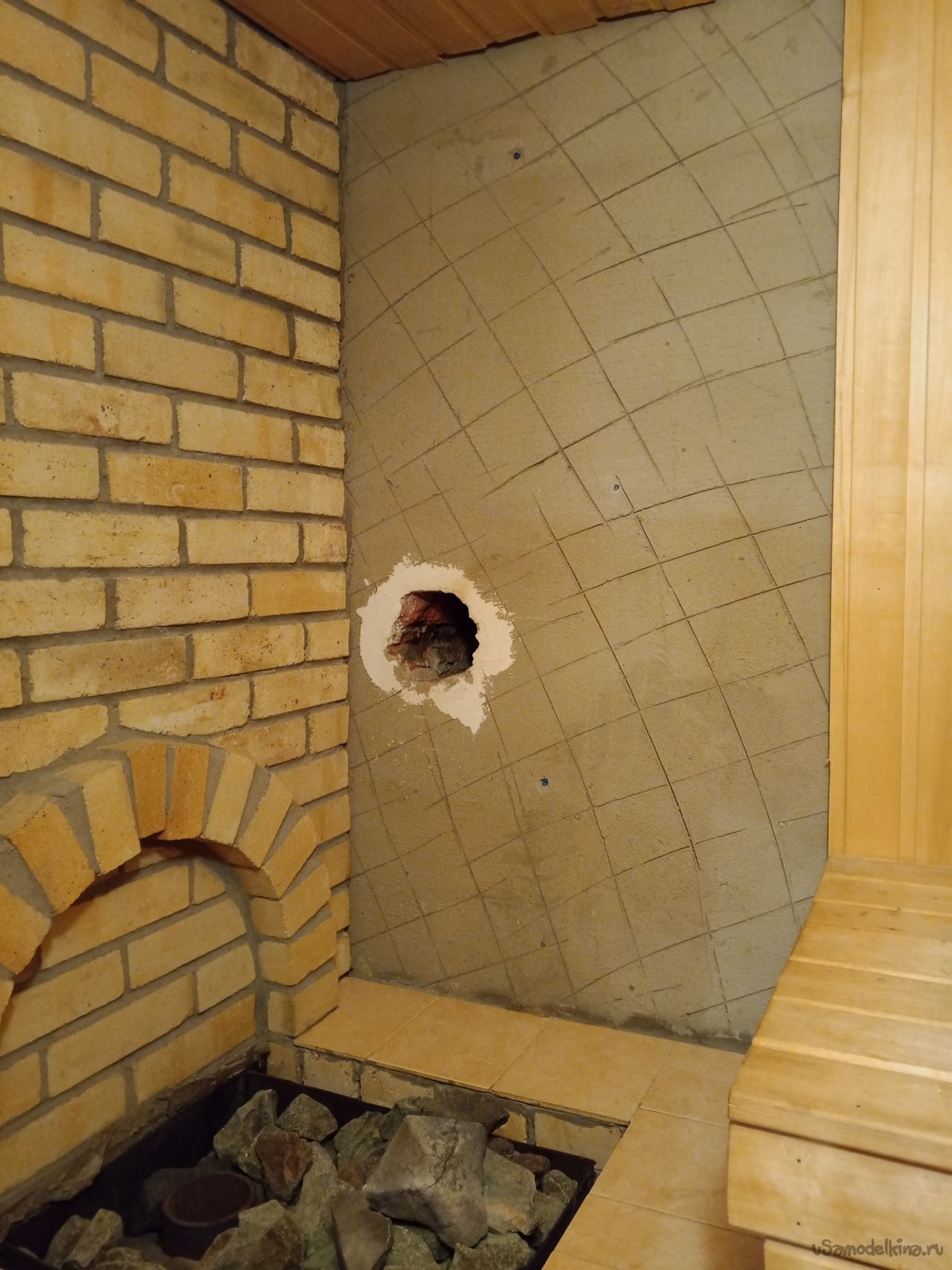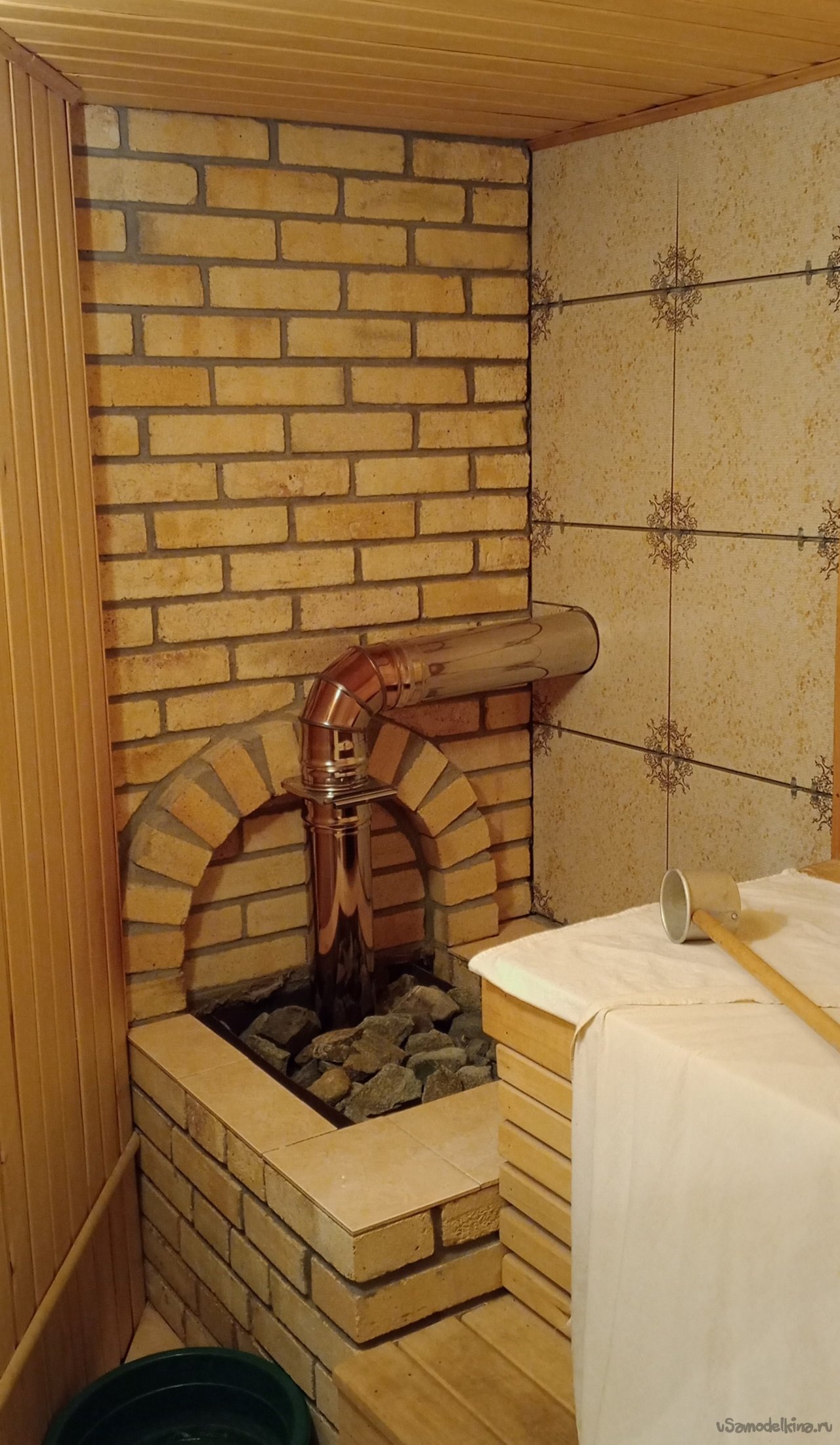Сауна располагается в доме, отдельным помещением, используется в основном в зимний период. Печь работает на газе, стационарно подведенного газопровода. Газоход в шахту вентиляции, угловая наборная труба 120 мм. с поворотным шибером. Стена капитальная.